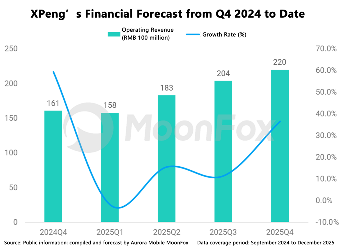 XPeng is expected to deliver 125,000–132,000 vehicles in Q4 2025. Based on Aurora Mobile - MoonFox user data and a Financial Model, XPeng’s revenue in Q4 2025 is projected to grow 36.6% YoY to approximately RMB 22 billion.