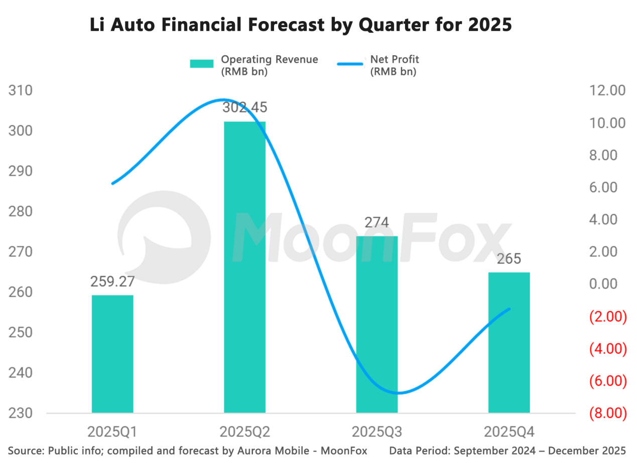 For Q4 2025, Aurora Mobile - MoonFox forecasts Li Auto’s revenue at RMB 26.5 billion (approximately USD 3.786 billion), down 40% YoY.