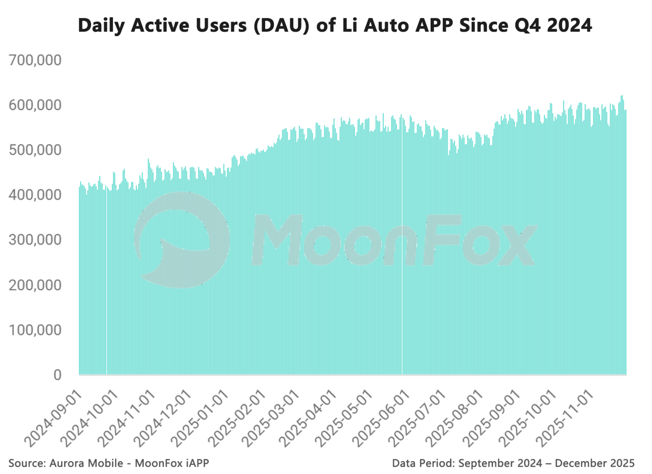 Although Deliveries have continued to decline, data from Aurora Mobile - MoonFox show that Li Auto’s app user engagement is very high and has remained on a steadily rising trend. Overall, the company’s core consumer base demonstrates strong stickiness, which is currently the key to any turnaround for Li Auto. At present, Li Auto urgently needs to enhance product competitiveness; staying focused on its core auto manufacturing business is the right path for future development.