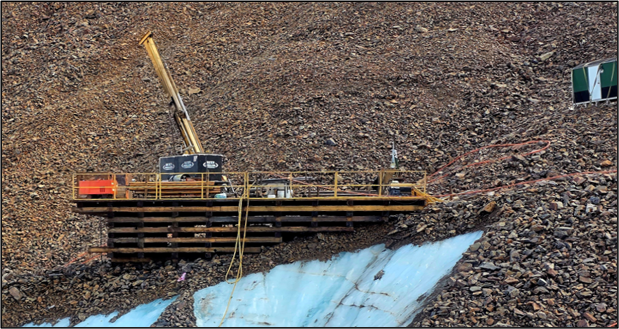 The latest diamond core drill results continue to increase resource confidence at the RPM Valley deposit. All holes encountered mineralization at the base of the ice, which averaged 60m to 70m down hole. The holes drilled from Pads 23-14 and 25-2 all encountered granodiorite at the base of ice, except for RPM-071, which was drilled to the east and encountered hornfels bedrock at approximately 65m. Drilling in the valley has been relatively sparse compared to RPM North, and this season’s efforts aimed to increase resource confidence and delineate what is shaping up to be a much larger mineralized intrusive unit. Drilling access is difficult here due to the nature of moraines, and difficulties were encountered coring through ice on the shallower dipping holes. Figure 1 below shows the drill setup on pad 25-2.