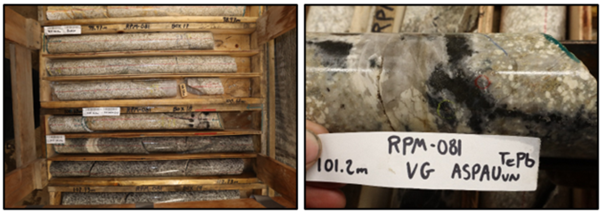 Figure 2.RPM Valley hole RPM-081 0.5m @ 364.0 g/t Au at 101m, with visible gold observed in the assayed core