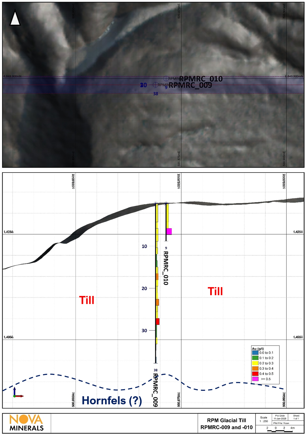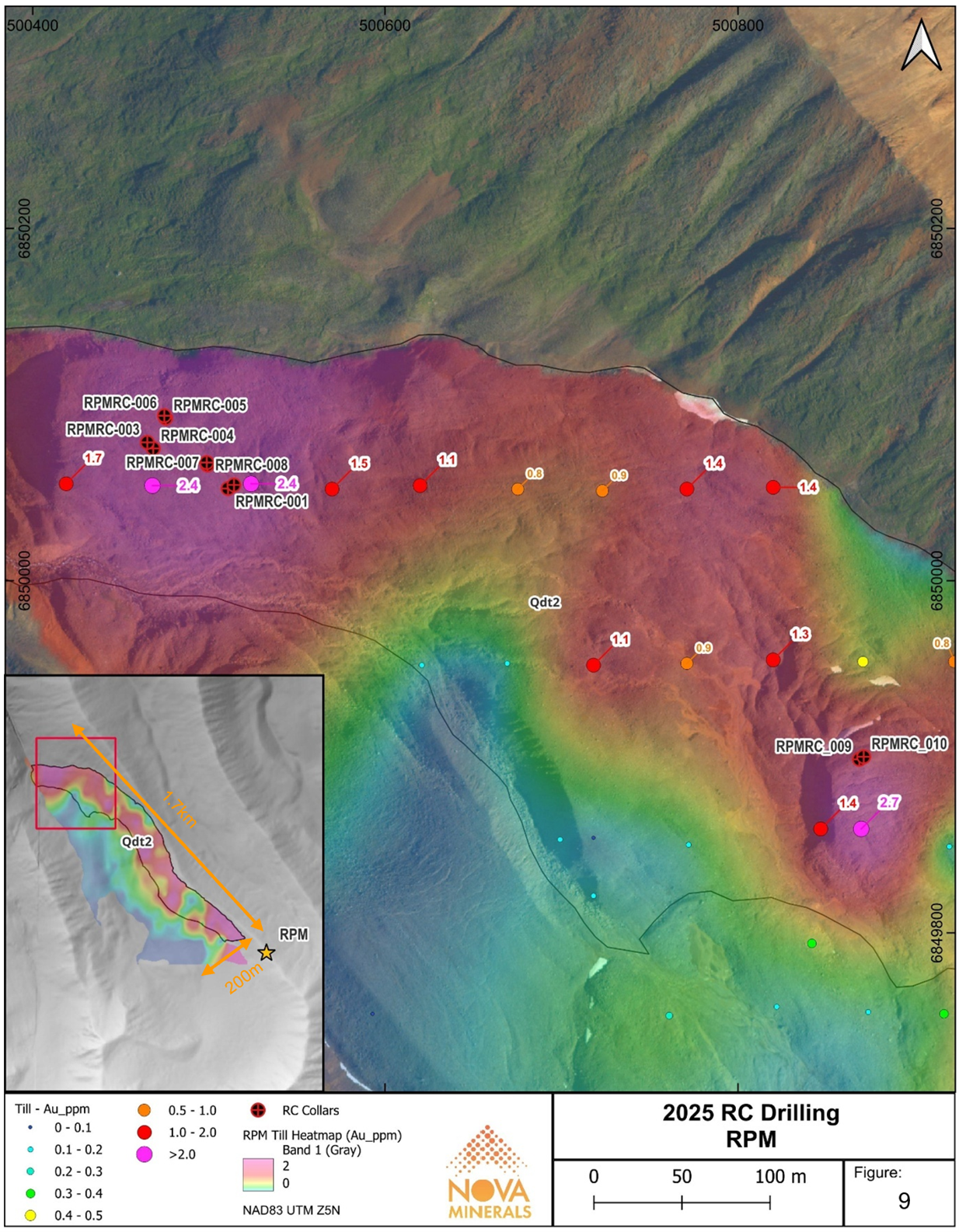 - 10 RC holes were completed in the RPM glacial till using Nova’s in-house rig as a preliminary, cost-effective test, returning a notable intercept of 33 m @ 0.3 g/t Au from surface (RPMRC-009). Results indicate the essentially drilled and blasted till material may be at least 30m thick over ~330,000 m², and this area remains a high-priority target, with future work to focus on improved sampling methods and thickness verification (Table 3 and Figure 8).
