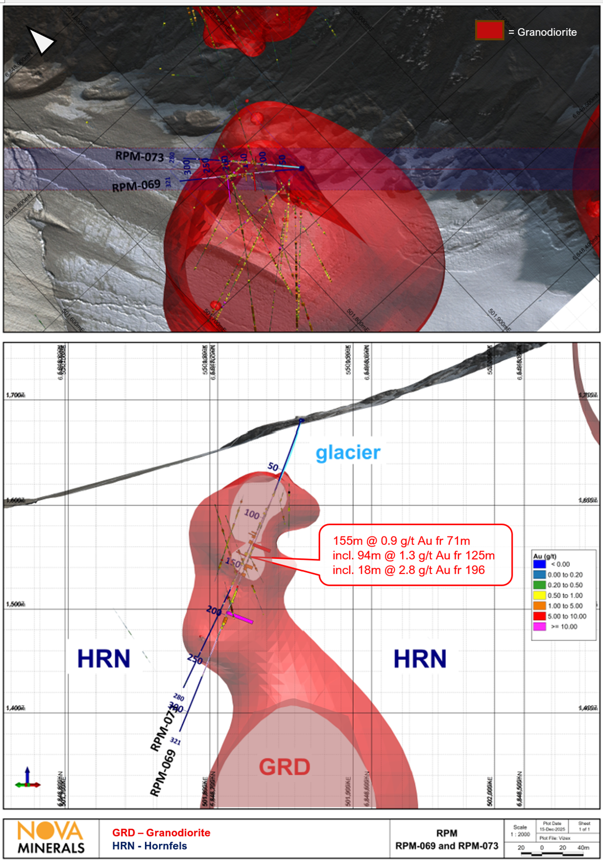 - RPM-025: 76m @ 1.2 g/t Au from 440m, including 43m @ 1.5 g/t Au from 474m, and 30m @ 1.7 g/t Au from 486m