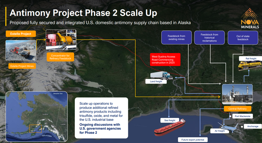 In October 2025, Nova secured a land use permit for an antimony refinery at Port MacKenzie, supporting the development of a U.S. critical minerals hub and enabling the establishment of downstream antimony processing and refining operations in Alaska’s Matanuska-Susitna Borough, a region with established infrastructure and capacity for rapid development.