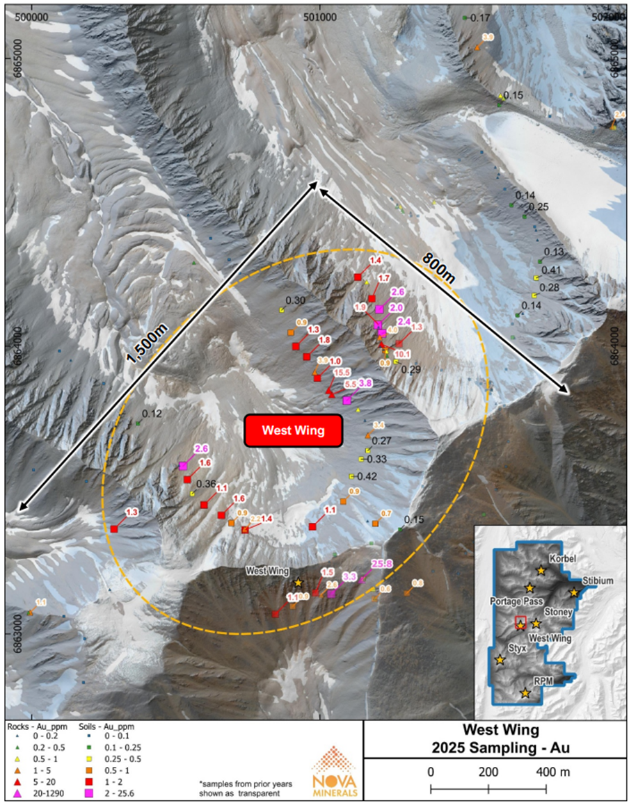 Post-period, surface sampling at Portage Pass identified a significant new gold anomaly supported by seven rock samples grading >2 g/t Au, including a high of 14.3 g/t Au, and 10 soil samples grading >0.5 g/t Au with a peak of 1.8 g/t Au. The anomaly extends across a broad, coherent target area and is associated with favourable lithological and structural settings, including similarities to the nearby Korbel deposit style of mineralisation.