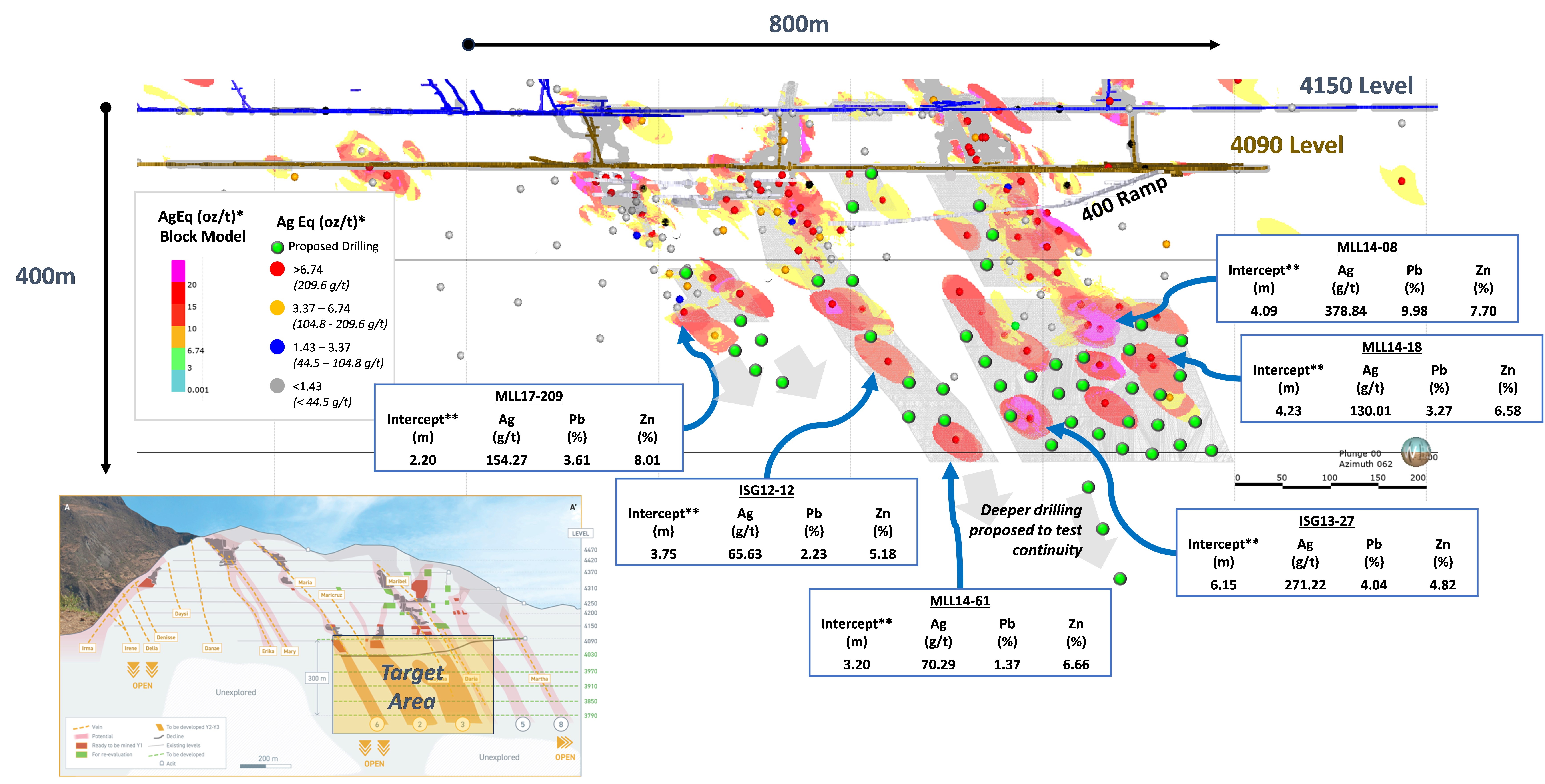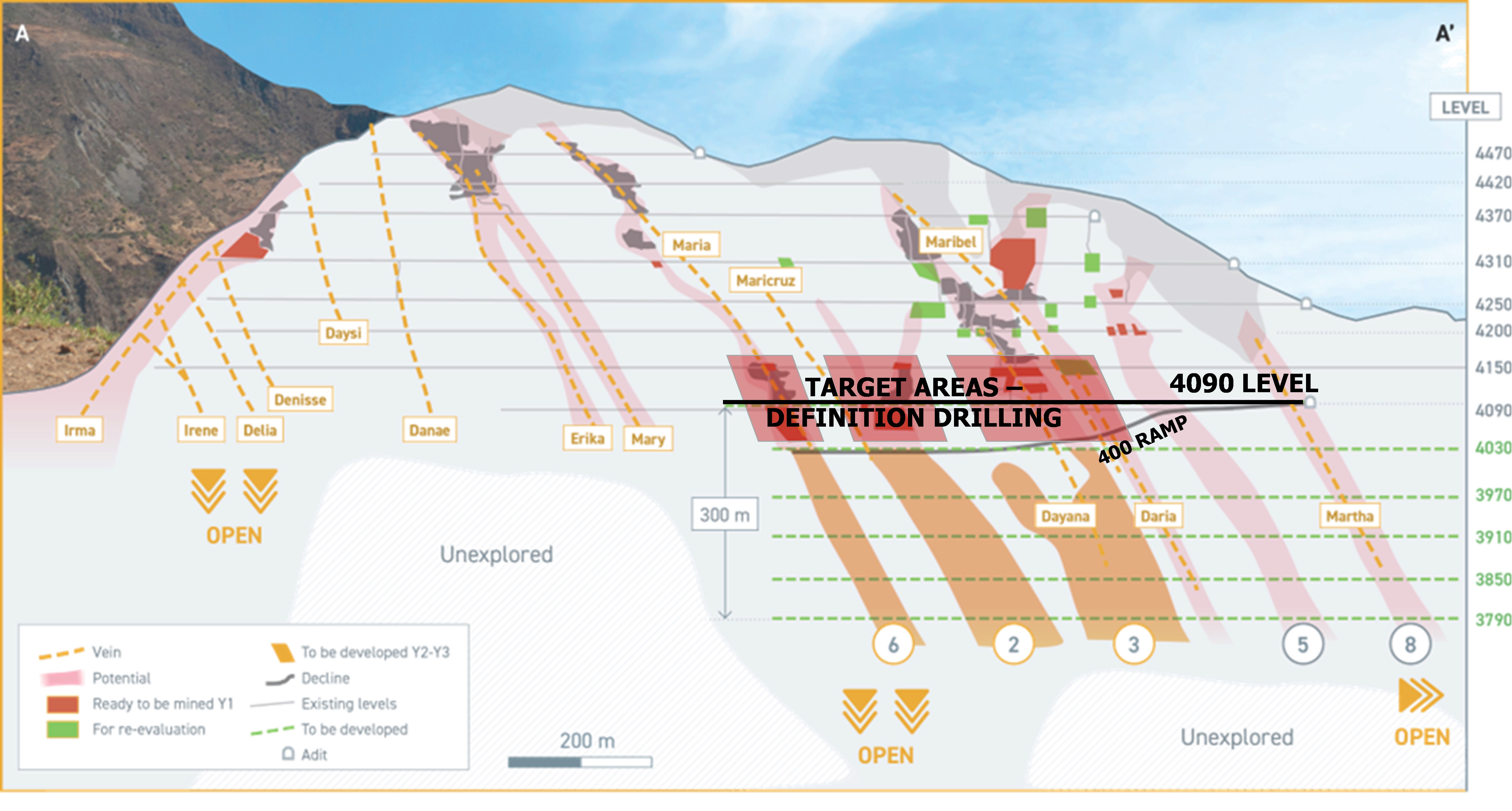 Program Overview:This definition drill program targets currently accessible areas of mineralization along Clavos 2, 3 and 6, along the 4090 level and their downward plunge to a depth of 200 metres to support the mine restart and Mallay mill capacity of 600 tonnes per day. These areas are prioritized for accessibility, known mining widths suitable for mechanized cut-and-fill extraction, and potential to expand on existing mineralization.