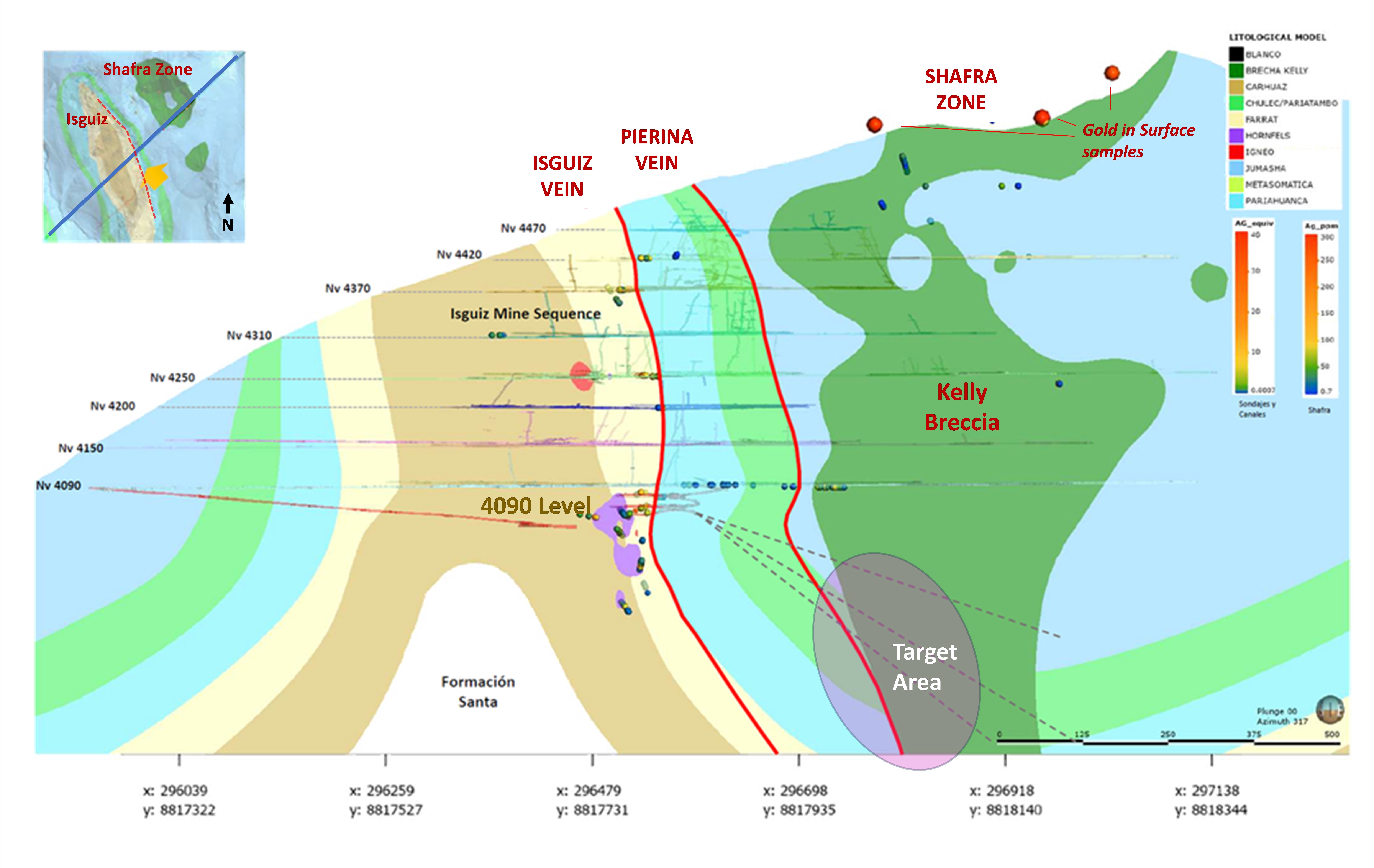 The Mallay mine encompasses several underexplored mineralized systems within reach of the Mallay Ag-Pb-Zn deposit infrastructure, including the Shafra Zone, a broad zone of bleached, structurally deformed limestone which hosts documented gold-enhanced silver-lead-zinc mineralization. This Shafra target, a deep-seated intrusive associated bulk tonnage mineralized host will be prioritized in the initial Mallay exploration drill plan. Evidence for the Shafra target comes from surface sampling, study of available core and interpretation and understanding of local geology and the structure and lithological setting. This includes the presence of a prominent zone of crackle breccia - the Kelly Breccia - which is spatially associated with a swarm of narrow, near-vertical gold-and-silver-rich base metal carrying veins.