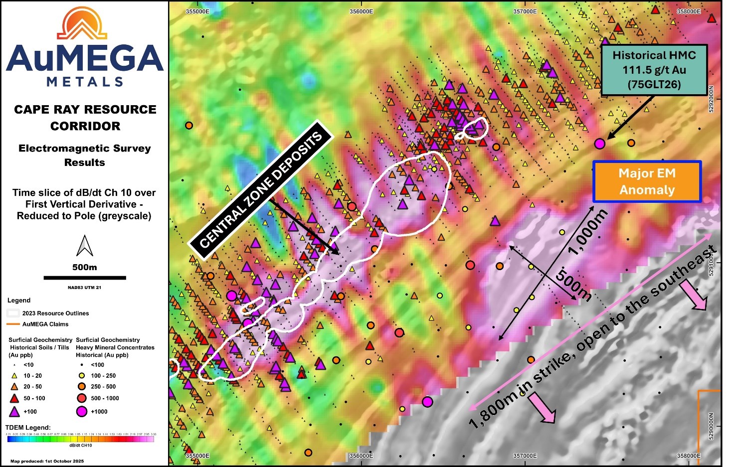 AuMEGA's systematic exploration strategy continues to generate compelling targets across the Cape Ray Shear Zone ("CRSZ"). This program will focus on a large, newly defined airborne electromagnetic ("EM") conductor located in the immediate hangingwall of the Central Zone - a proven high-grade gold system (Figure 2)1.