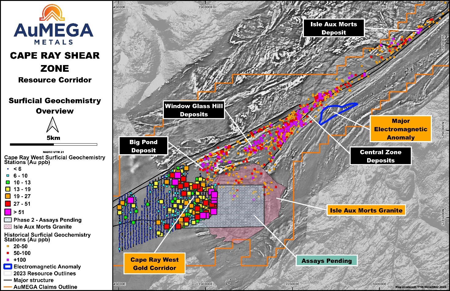 AuMEGA's Cape Ray Shear Zone hosts several dozen high potential targets along with its existing defined gold Mineral Resource of 6.2 million tonnes grading an average of 2.25 g/t, totaling 450,000 ounces of Indicated Resources, and 3.4 million tonnes grading an average of 1.44 g/t, totaling 160,000 ounces in Inferred Resources5.