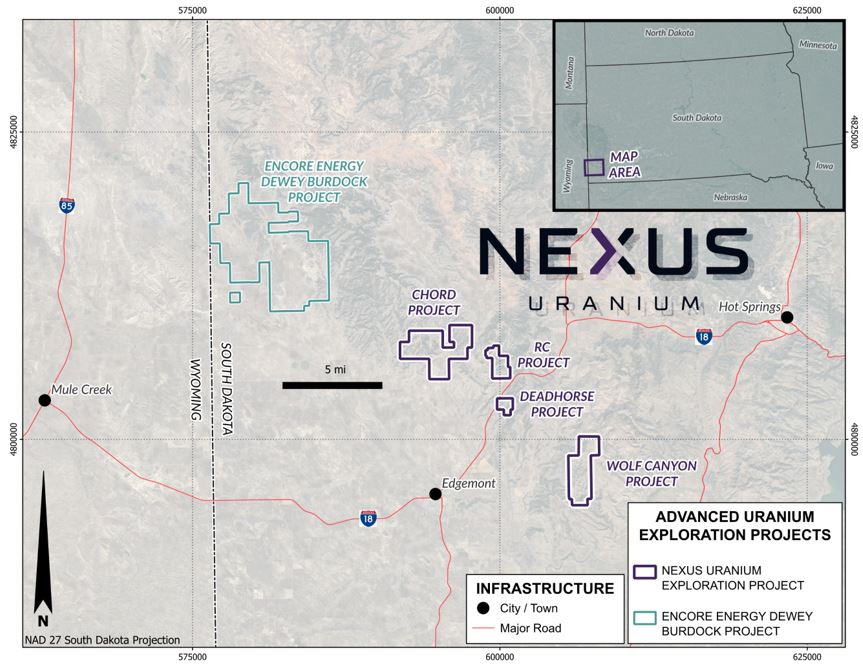The RC project comprises 40 unpatented lode mining claims totalling approximately 800 acres, located within one mile of the Company's flagship Chord uranium project in Fall River County, South Dakota. Combined with the recently announced Deadhorse acquisition (17 claims, ~340 acres), Nexus has added 57 claims totalling approximately 1,140 acres to its South Dakota land position in January 2026 alone, bringing the Company's total South Dakota holdings to approximately 6,380 acres.