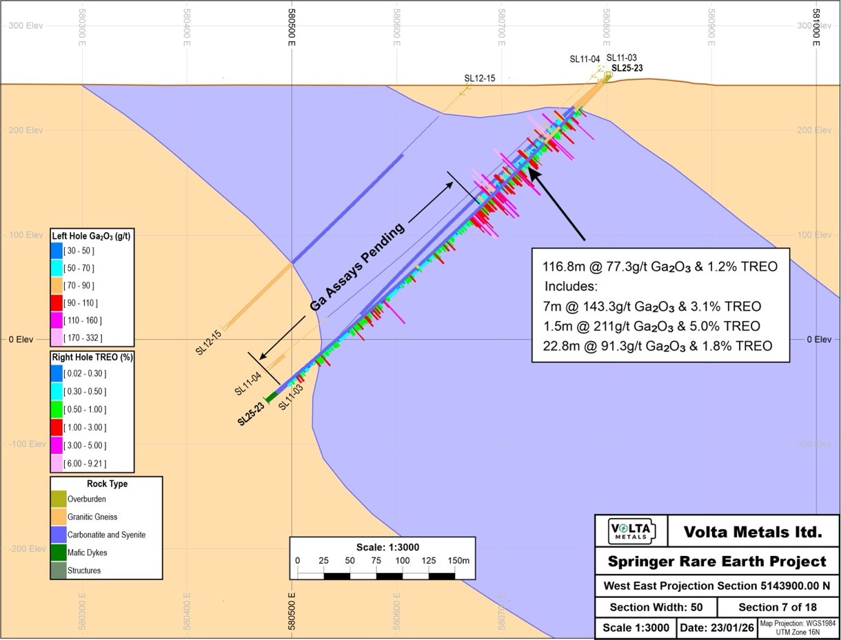 Toronto, Ontario--(Newsfile Corp. - January 26, 2026) - Volta Metals Ltd. (CSE: VLTA) (FSE: D0W) (OTC Pink: VOLMF) ("Volta" or the "Company") is pleased to report initial gallium assay results from its Springer Rare Earth Project in Sturgeon Falls, Ontario, Canada. The newly received assays from drill hole SL25-23 confirm thick, continuous gallium mineralization over a 116.8m interval grading 77 g/t Ga2O3, including multiple high-grade zones exceeding 100 g/t Ga2O3 (Figure 1).