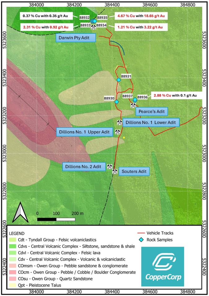 - 8 m @ 0.97 % Cu from Pearce's Adit2