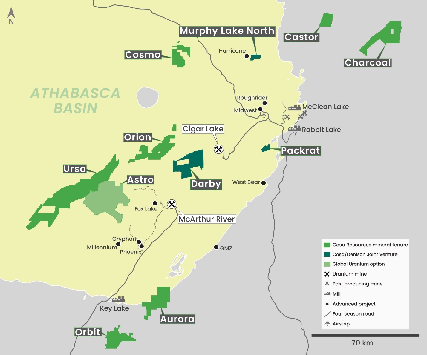 In January of 2025, the Company entered a transformative strategic collaboration with Denison Mines (TSX: DML) (NYSE American: DNN) that has secured access to several additional highly prospective eastern Athabasca uranium exploration projects. As Cosa's largest shareholder, Denison gains exposure to Cosa's potential for exploration success and its pipeline of uranium projects.