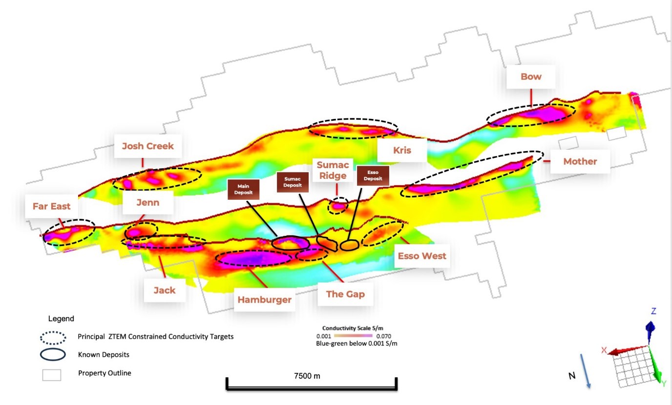 Additional parallel and fold repeated VMS target time horizons extend over 20 km of strike each and contain several ZTEM conductivity high anomalies that provide further discovery opportunity called, Jenn, Mother, Far East, Kris, Bow, Sumac Ridge and Josh Creek.