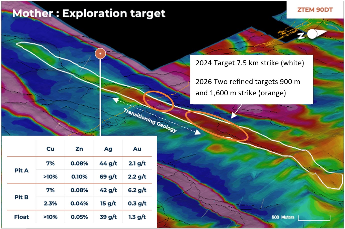 The Mother target has been refined by constraint of the ZTEM inversion into two separate high conductivity targets each measuring 950 m and 2000 m in strike length by 200 - 350 m dip direction. This near surface target has supporting VTEM conductor anomalies, portions of which have only been tested by four short drill holes from the 1970's and define a prospective geological environment for a potential VMS deposit. Two historical holes anchored on the western extents of the target intersected an interpreted felsic flow dome consisting of a combination of sericite altered quartz, quartz - feldspar and lapilli felsic tuffs similar to the setting of the Main, Sumac, and Esso deposits. Silica exhalites with jasperoid development, and bands of magnetite and semi massive - massive sulphides occur between felsic units. These exhalites returned surface rock chip samples that ranged from 2.3% to greater than 10% Cu, 0.04% - 0.10% Zn, 15 g/t - 69 g/t Ag and 0.3 g/t - 6.2 g/t Au over widths of 2.5 to 5 cm. Two drillholes located 2 km and 5 km to the west of these holes intersected more distal felsic tuffaceous volcanic rocks and mudstones. Mother presents as a high conviction, near surface target where surface mapping and historic drilling indicates a productive VMS environment could be preserved.
