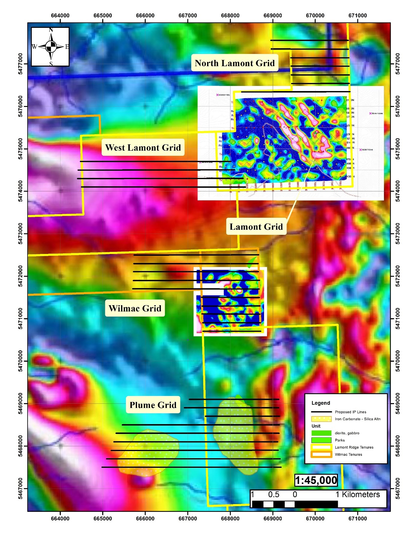 The proposed 2026 program will include four geophysical surveys on four survey grids - North Lamont, West Lamont, Wilmac, and Plume - designed to systematically expand and infill the Company's geophysical coverage along Lamont Ridge (See Figure 1). Two of the four surveys (North Lamont and West Lamont) will be merged with the previously completed Lamont survey to create a single, integrated dataset covering the interpreted alteration and mineralized halo of the western portion of the West Lamont Intrusive Complex. A third survey will complete the Wilmac survey, which the Company partially completed in November 2025. The fourth survey, Plume, targets two separate and extensive iron carbonate-silica alteration zones approximately four kilometres to the south-southwest of the Wilmac survey.