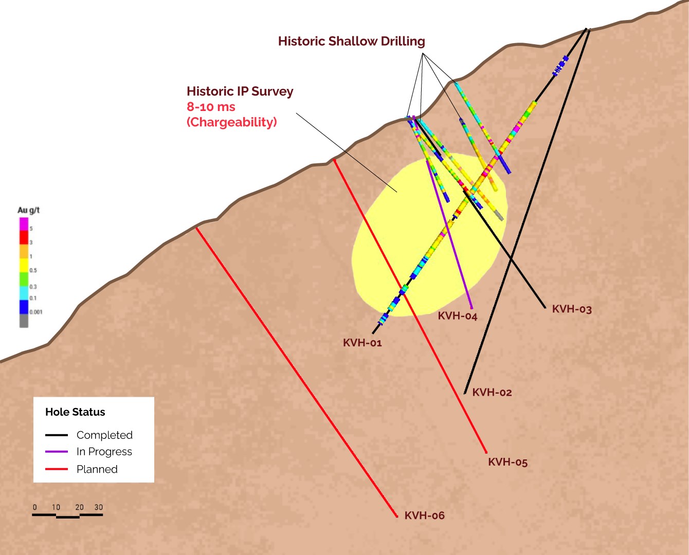- KVH-01 intersected 58.9 metres @ 2.50 g/t AuEq from 38.6m (2.43 g/t Au, 2.75 g/t Ag, 0.02% Cu),