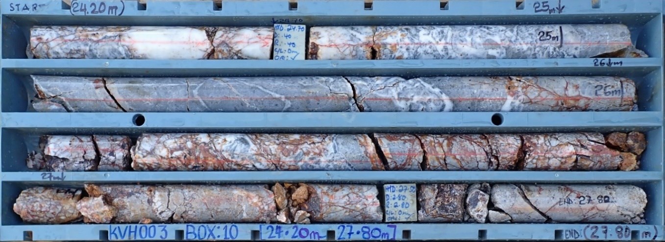 Drill hole KVH-03 has now been completed, with geological logging identifying strong silica flooding and multi-phase quartz veining from approximately 5 m to 51 m downhole. Detailed logging and sampling are currently underway (Figures 4 and 5).