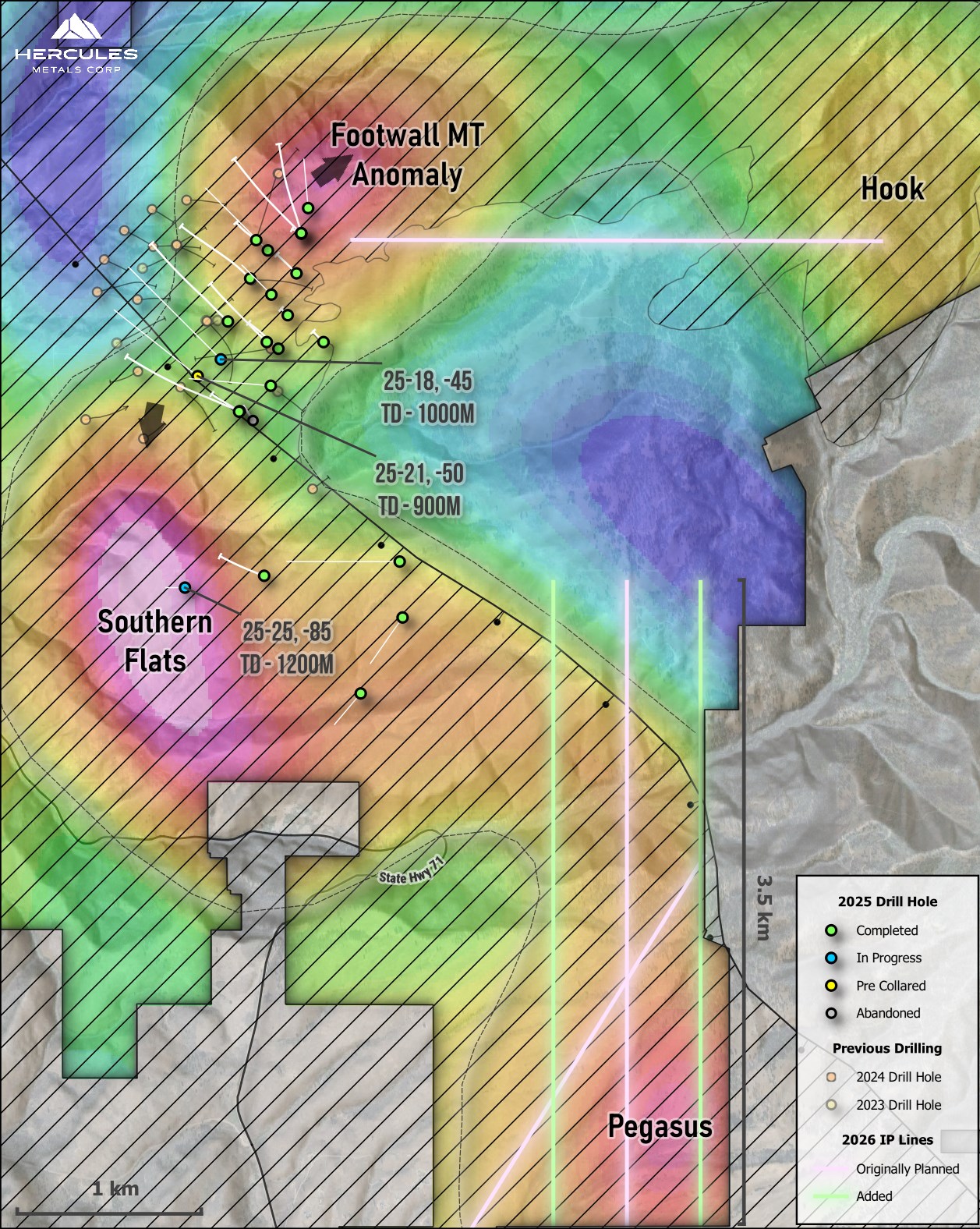 - Reconnaissance IP Survey Complete at New MT Targets -A series of 2D induced polarization ("IP") lines were completed over the new Pegasus and Hook MT anomalies, to focus targeting ahead of initial drill testing. Two planned lines were completed at Pegasus, followed by two additional lines to extend a significant chargeability response identified in the preliminary results. One planned line was completed at the Hook target, which returned the strongest chargeability response of the survey. Additional IP lines at the Hook target are planned for Q2, once weather conditions at higher elevations allow for more efficient ground surveying. Final results are pending and will be released once received.