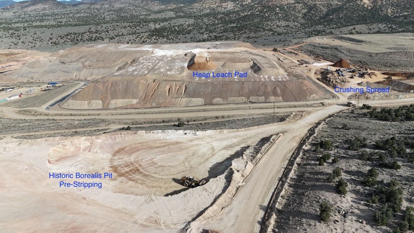 Figure 1 - Active pre-stripping and mining in the Borealis Main Pit adjacent to the heap leach pad and crusher