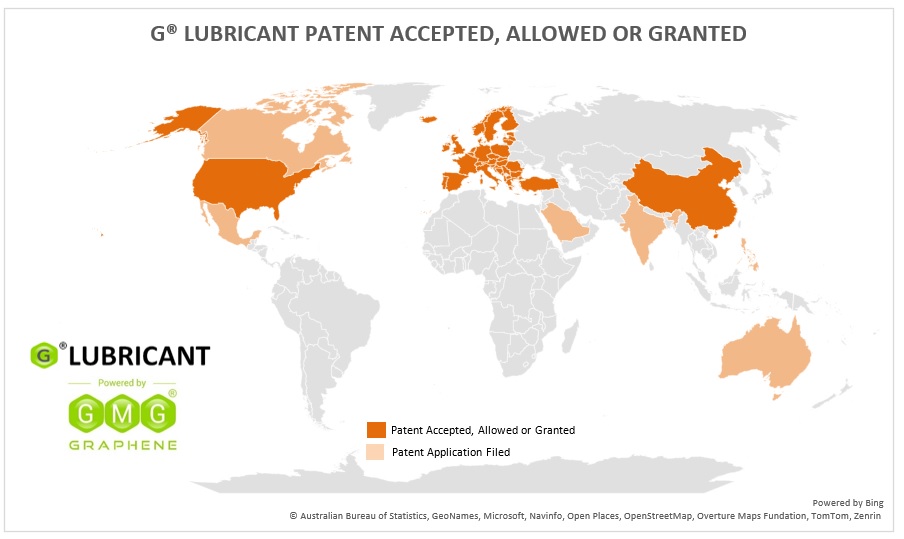 Brisbane, Queensland, Australia--(Newsfile Corp. - April 20, 2026) - Graphene Manufacturing Group Ltd (TSXV: GMG) (OTCQX: GMGMF) ("GMG" or the "Company") is pleased to advise that GMG's patent for GMG's Graphene Engine Oil Additive, G® LUBRICANT, has now been granted for 20 years in the USA and allowed in China. This is in addition to the previously announced G® LUBRICANT patent accepted for the European region. There are various other countries around the world where this patent application is progressing as well, which are shown in Figure 1.