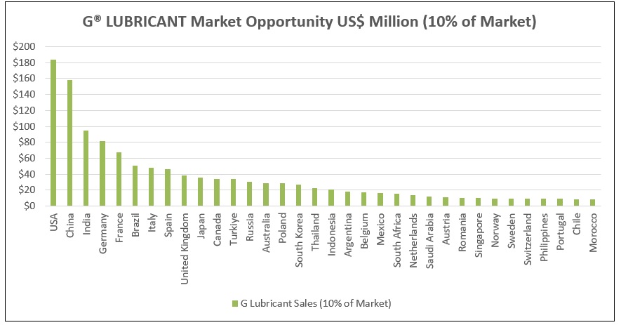 Assuming an average fuel savings of 8.4%, GMG believes that a conservative estimate of the potential market for G® LUBRICANT is 10% of the fuel savings realized by users annually. Assuming G® LUBRICANT pricing equal to 10% of the savings realized, GMG estimates that the potential global revenue for G® LUBRICANT is US$ 1.2 Billion sales per annum based on 2025 actual sales. Figure 3 shows GMG's estimates of potential annual sales of G® LUBRICANT by country.