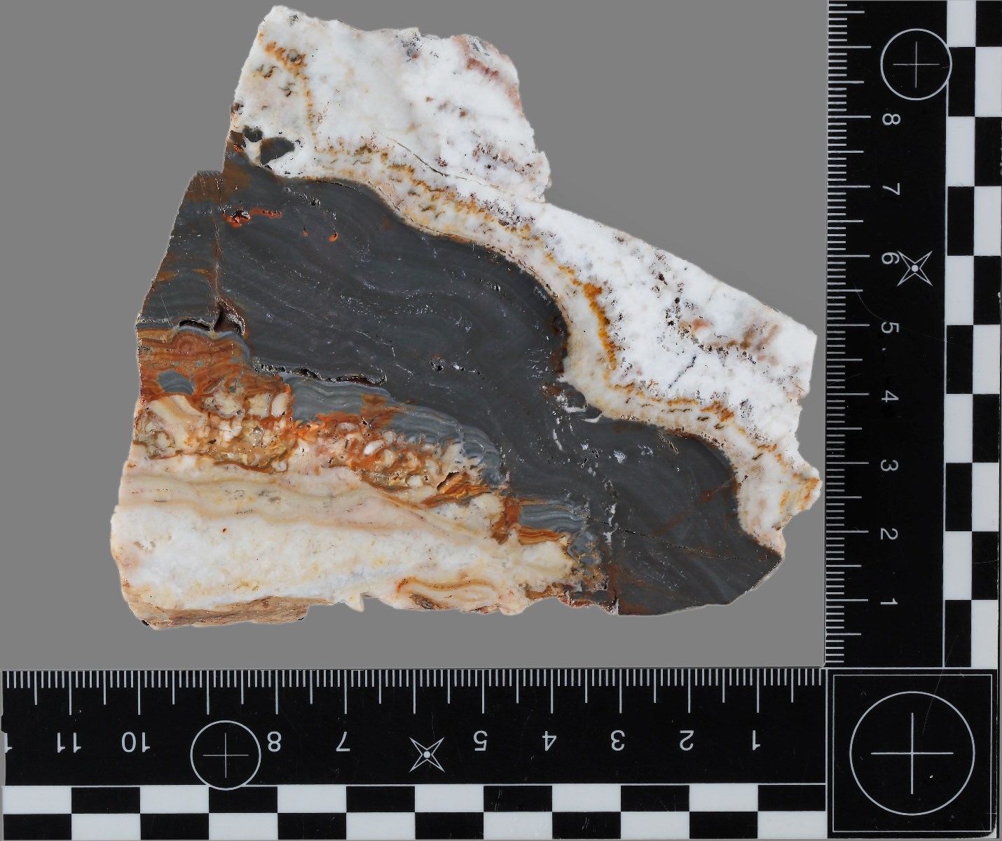 Figure 2: Hand sample of mineralization with typical rhythmic banding. The black area is composed of very fine-grained pyrite. This sample was found as float on the site and will be sent in for assay.