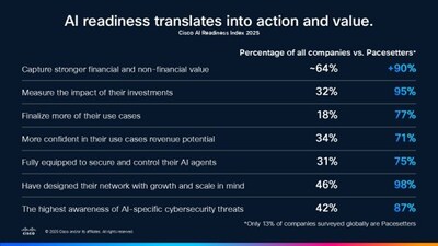 SAN JOSE, Calif., Oct. 14, 2025 /PRNewswire/ -- Cisco (NASDAQ: CSCO), the worldwide leader in networking and security, today released the results from the third annual CiscoAI Readiness Index. A small but consistent group of companies surveyed — the 'Pacesetters,' about 13% of organizations for the last three years — outperform their peers across every measure of AI value, captured for the first time in Cisco's global study of over 8,000 AI leaders across 30 markets and 26 industries. The Pacesetters' sustained advantage indicates a new form of resilience: a disciplined, system-level approach that balances strategic drivers with the data and infrastructure needed to keep pace with AI's accelerating evolution. They're already architecting for the future with 98% designing their networks for the growth, scale and complexity of AI compared to 46% overall. The combination of foresight and foundation is delivering real, tangible results at a time when two major forces are starting to reshape the landscape: AI agents, which raise the bar for scale, security, and governance; and AI Infrastructure Debt, the early warning signs of hidden bottlenecks that threaten to erode long-term value. "We're moving past the era of question-answering chatbots and stepping into the next major phase of AI: agents that independently execute tasks," said Jeetu Patel, Cisco's President and Chief Product Officer. "Today's study shows that over 80% of companies are prioritizing agentic solutions, with two out of three reporting that these systems are already meeting or exceeding their performance goals. The evidence points to a massive competitive advantage: companies that are further along are seeing dramatically stronger returns than their peers." The Pacesetter profile: Readiness as competitive advantage
