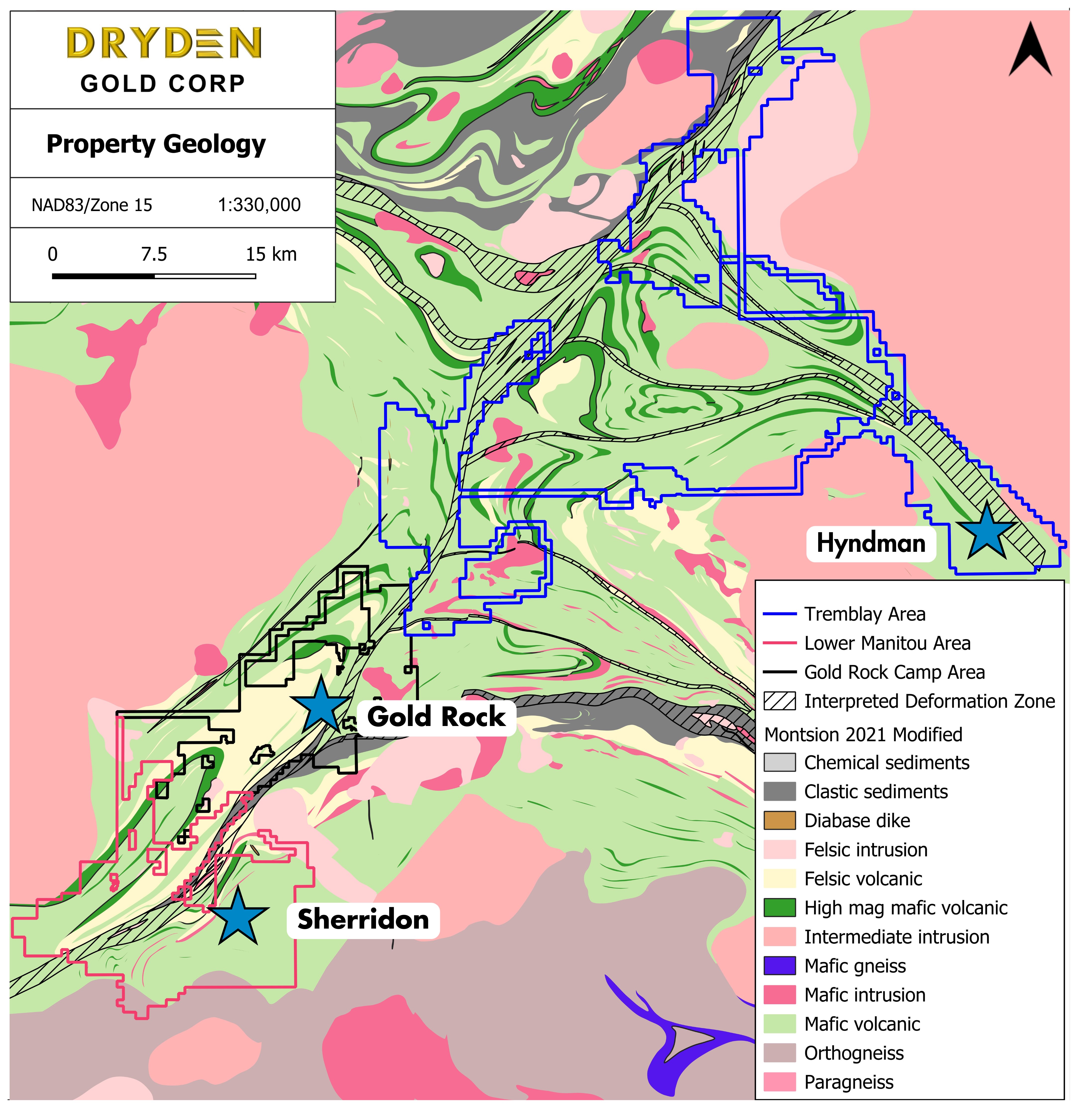 Dryden Gold Corp. is an exploration company focused on the discovery of high-grade gold mineralization listed on the TSX Venture Exchange ("DRY") and on the OTCQB marketplace ("DRYGF") and FSE ("X7W"). The Company has a strong management team and Board of Directors comprised of experienced individuals with a track record of building shareholder value through property acquisition and consolidation, exploration success, and mergers and acquisitions. Dryden Gold controls a 100% interest in a dominant strategic land position in the Dryden Gold District of Northwestern Ontario. Dryden Gold's property package includes historic gold mines but has seen limited modern exploration. The property hosts high-grade gold mineralization over 50km of potential strike length along the Manitou-Dinorwic deformation zone. The property has excellent infrastructure, enjoys collaborative relationships with First Nations communities and benefits from proximity to an experienced mining workforce.