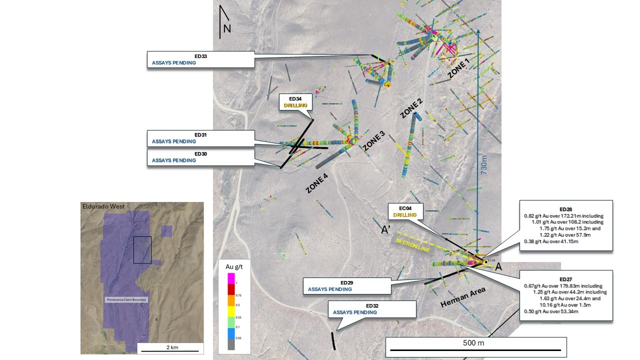 Provenance's CEO, Rauno Perttu commented, "We are confirming a broader target in the Herman Area that looks to substantially increase the mineralized footprint of the Eldorado property. The extensive volume of gold mineralization above this contact zone combined with strong grades in the contact zone and within the metasedimentary rocks, points to a much larger mineralized system than previously recognized. We are excited to receive further assays from ongoing drilling, including hole ED29 extending to the southwest in the Herman area that showed strong visual mineralization, supporting our data and our belief that mineralization continues southward and is open in all directions at Eldorado West. I believe we are only exploring a fraction of a very large gold system."