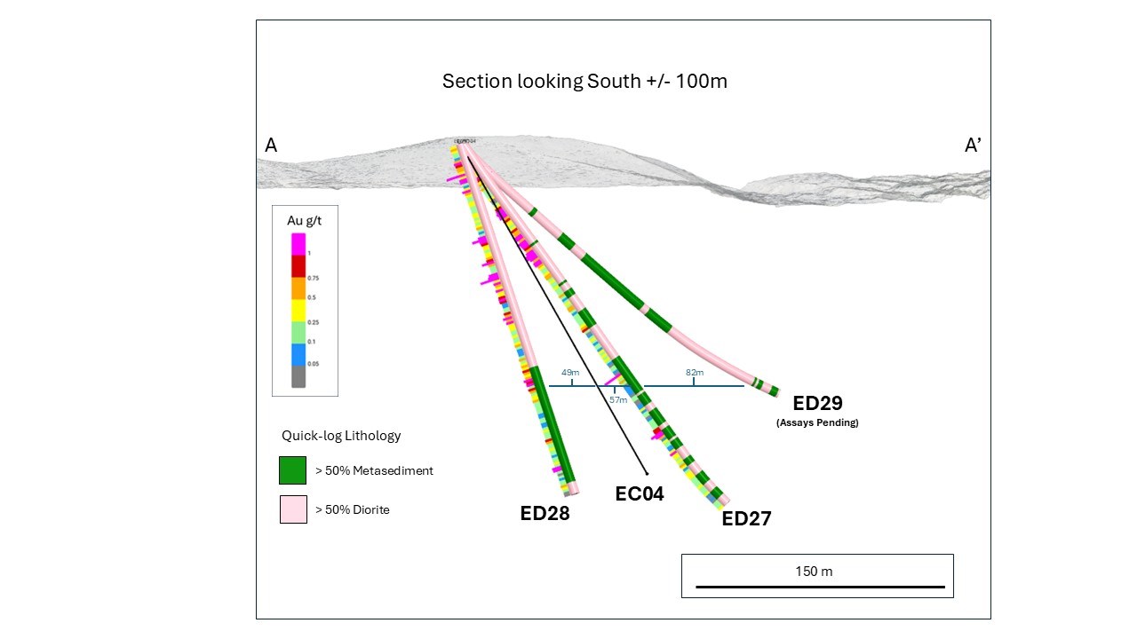 RC drilling continues and includes ED29 (assays pending), drilled southwestward from ED27. In addition, the core rig has arrived on site and drilling has commenced with EC04 located in the Herman Area (Figure1). Core drill holes will target the expansion of known mineralization and provide critical insights about the structural and geological controls on the system.