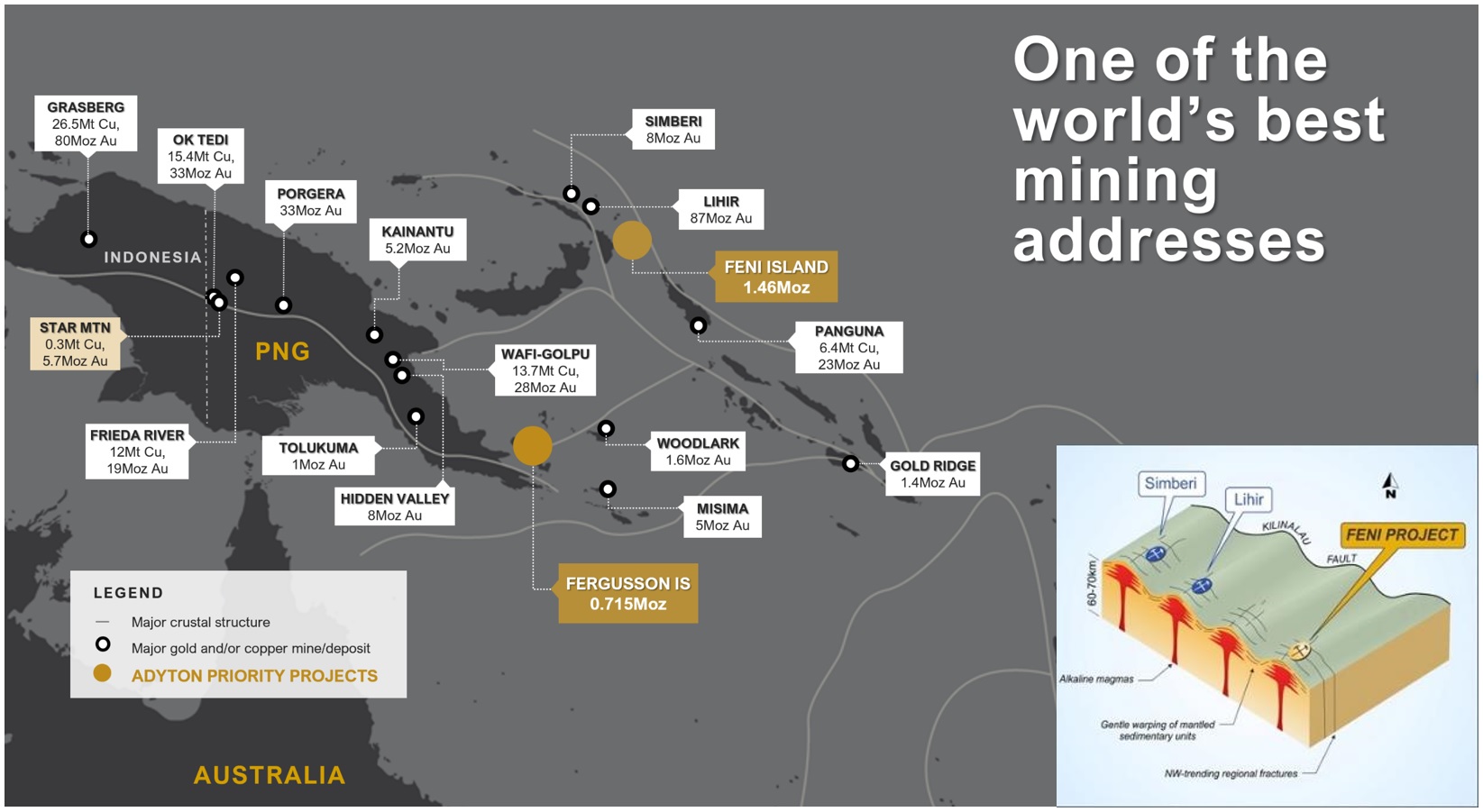 The Adyton Feni Island Au-Cu project is strategically located on the easily accessible Bismark Islands in PNG. Feni Island is part of the 250km long Tabar-Lihir-Tanga-Feni Island chain, which to the northwest hosts the operating gold mines of Simberi and the giant Lihir mine, while Feni hosts a foundational resource of 1.45moz Au. To the southeast of Feni Island, on Bougainville Island, lies the giant past producing Panguna Cu-Au mine.
