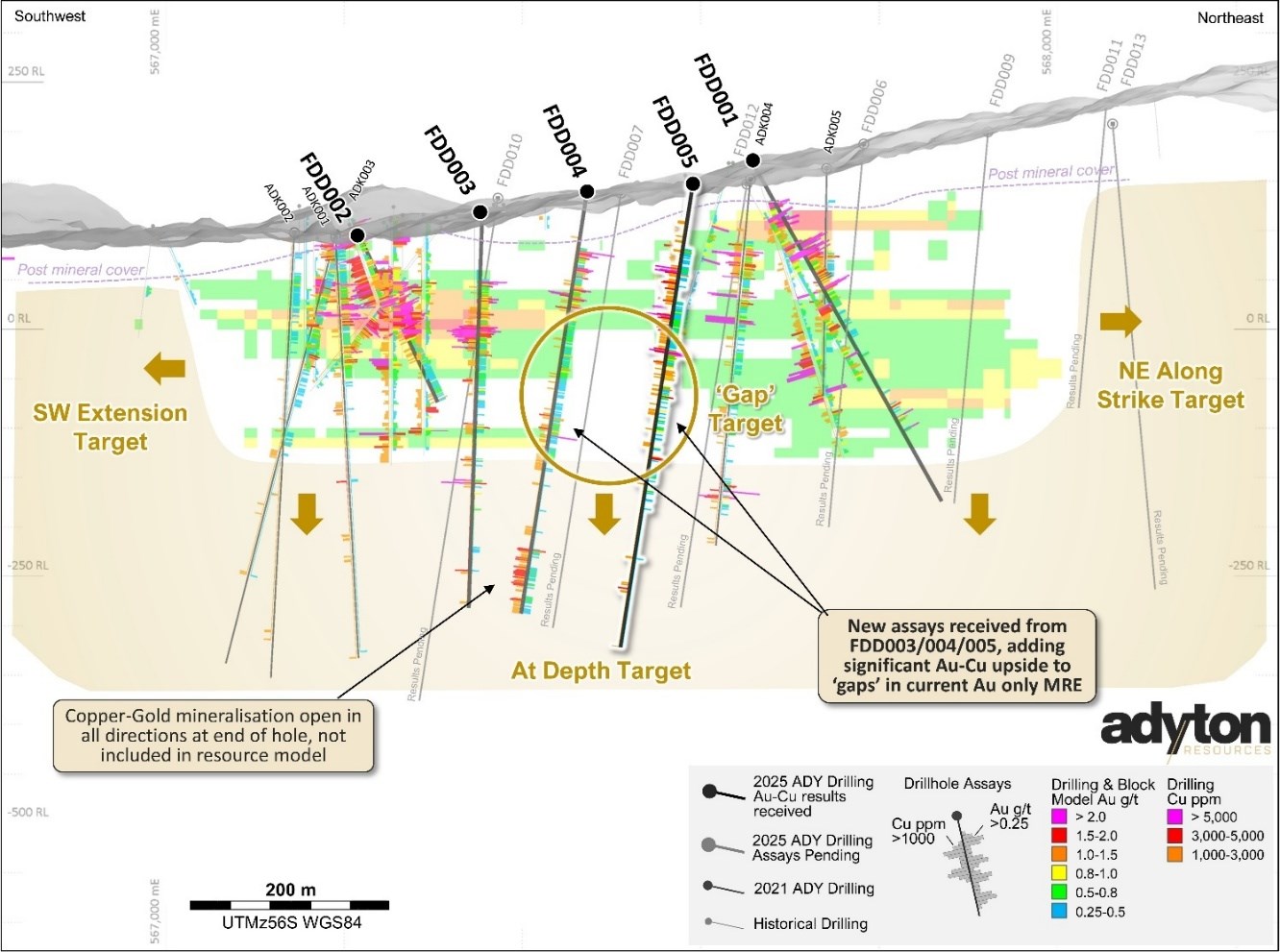 Brisbane, Australia--(Newsfile Corp. - October 14, 2025) - Adyton Resources Corporation (TSXV: ADY) ("Adyton" or the "Company") is pleased to report final assays from expansionary drill hole FDD005 at its 100% owned Feni Au-Cu project, Papua New Guinea. The results continue to confirm the significant scale of the Feni gold-copper mineral system, whilst also highlighting the challenges and opportunities of exploring a very large mineralized system that is under cover, particularly to target and intercept higher-grade gold-copper zones.