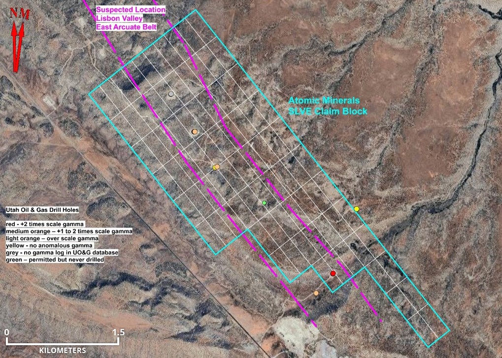Within Atomic's SLVE property nine widely-spaced historic oil and gas wells appear to define the southern end of this 20km by +750m belt as 'off-scale' radioactivity was recorded within the favorable Chinle Formation host rock over widths of 1.8 to 4.5 m (6 to 15 feet) from depths of 760 to 880 m (2,495 to 2,890 feet).3