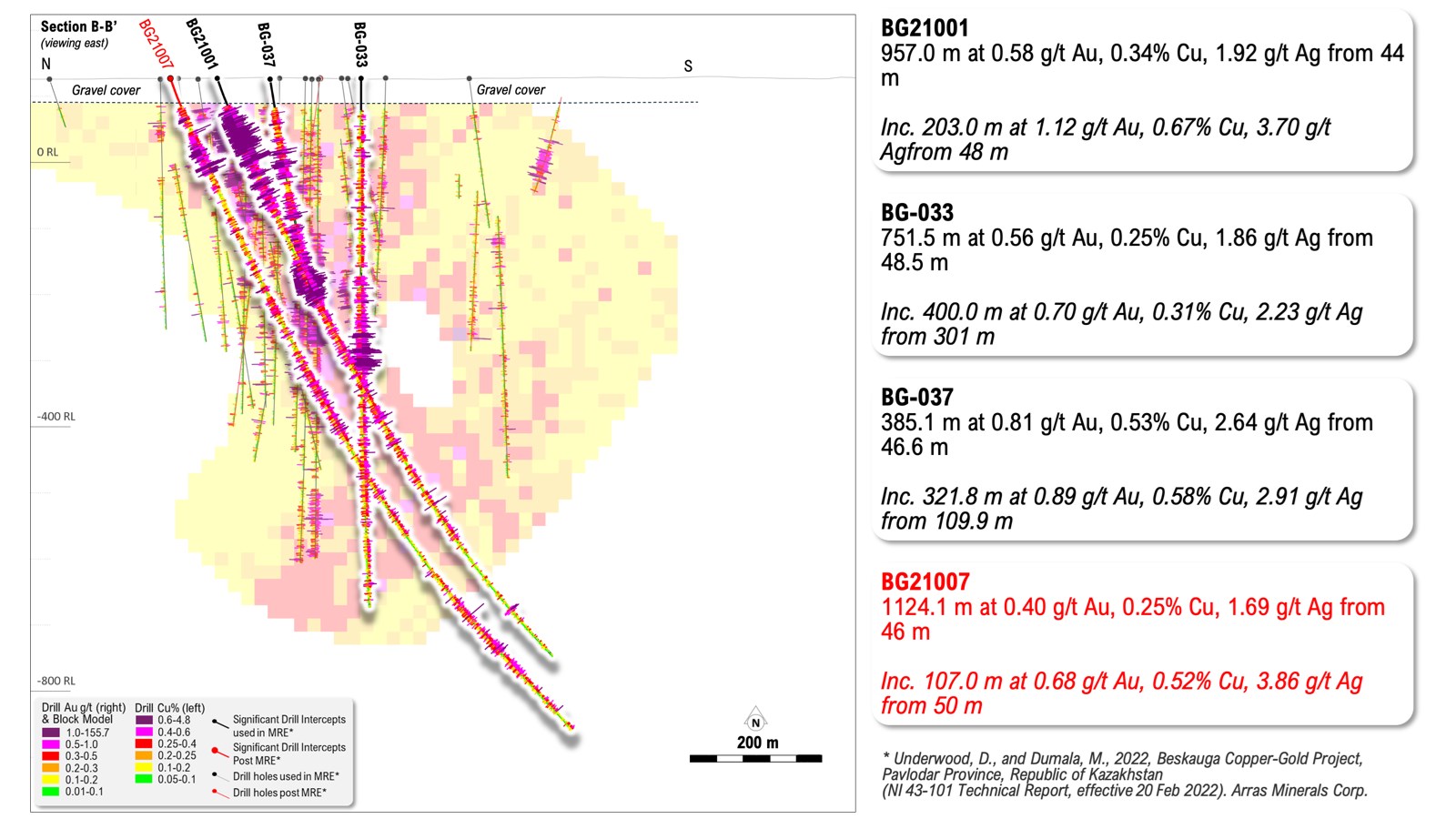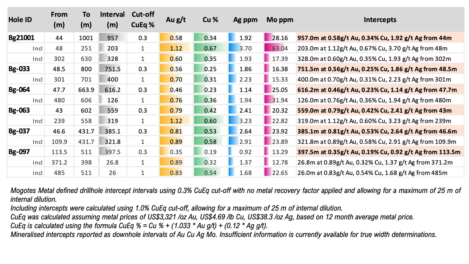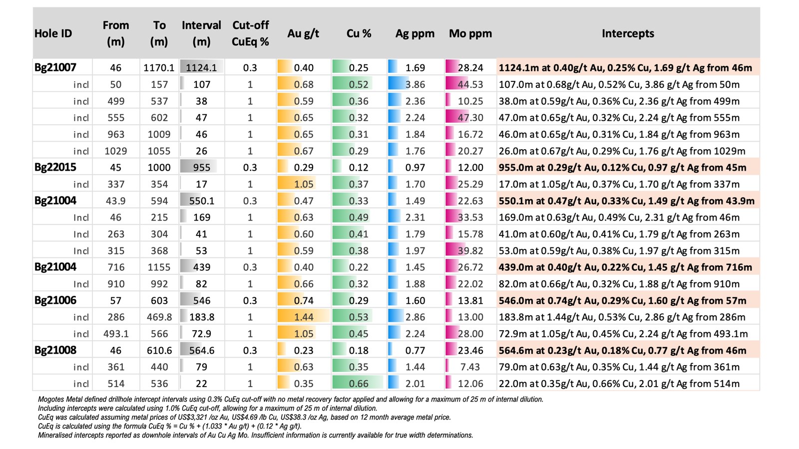 Incl. 203.0m at 1.12 g/t Au, 0.67% Cu, 3.70 g/t Ag from 48m - BG-033: 751.5m at 0.56 g/t Au, 0.25% Cu, 1.86 g/t Ag from 48.5m