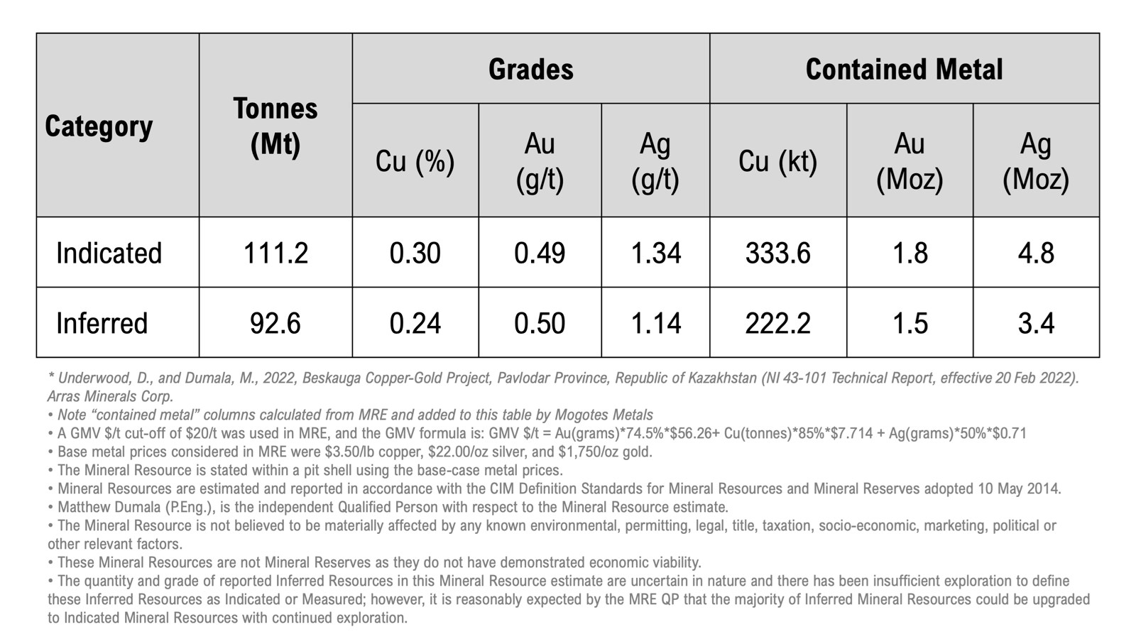 The mineral resource estimate referenced in this news release was originally prepared by David Underwood BSc (Hons) Registered Professional Natural Scientist, an independent Qualified Person as defined by NI 43-101, and disclosed in a technical report titled "Beskauga Copper-Gold Project, Pavlodar Province, Republic of Kazakhstan, Amended & Restated NI43 101 Technical Report" with an effective date of 20 February 2022, which is available under Arras Minerals Corp. SEDAR+ profile at www.sedarplus.ca.