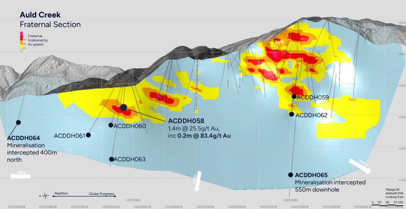 - Hole ACDDH058 in the northern end of the Fraternal resource envelope returned high gold grades, 0.5m @ 20.5 g/t Au, 0.2m @ 83.4gm/t Au and 0.7m @ 12.6 gm/t Au + 3.3% Sb(estimated true width of 7.3m). This is the highest individual gold assay grade in the Auld Creek deposit to date and importantly assists in delineating the orientation and continuity of high-grade mineralized shoots.