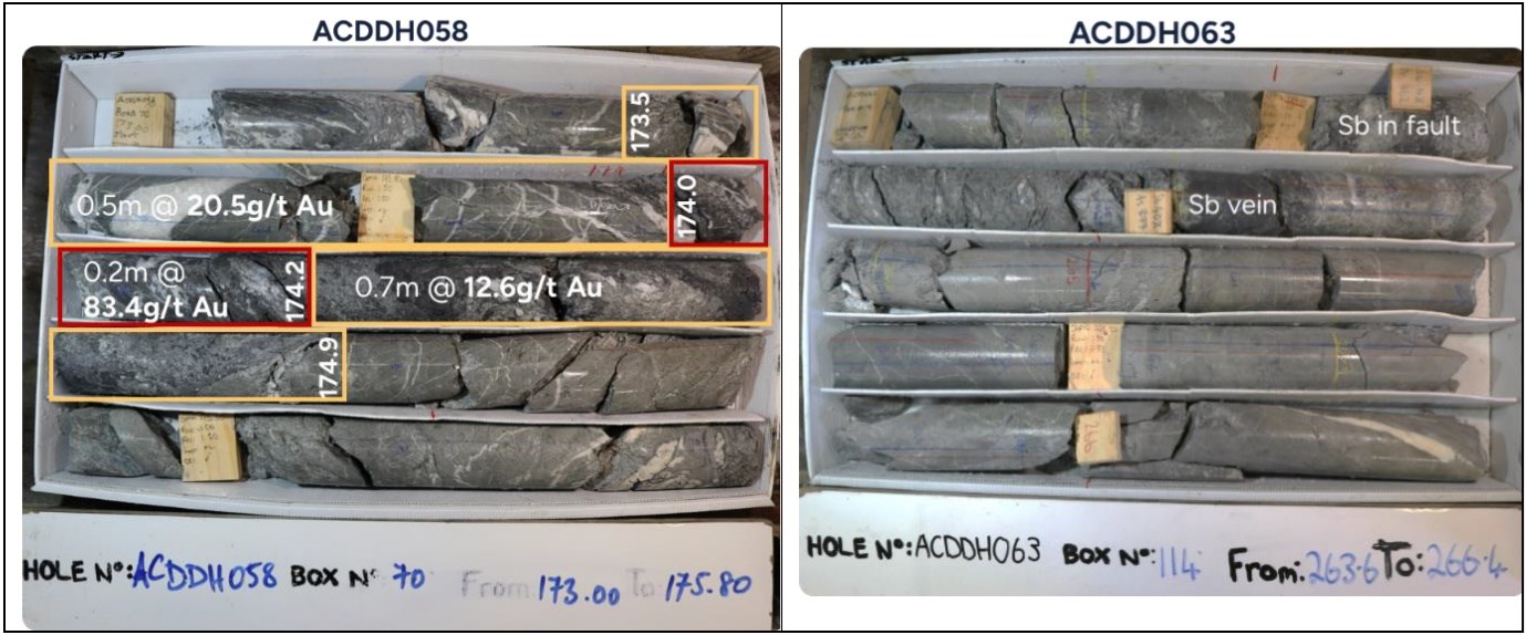 ACDDH059: 1.2m @ 7.6 g/t Au + 3.07 % Sb including 0.55m @ 14.1 g/t Au + 3.3% Sb (estimated true width 2.6m)