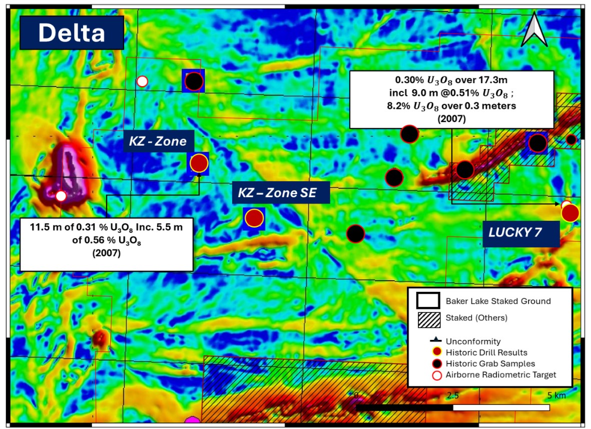 Figure 1. Horizontal derivative map of the Baker Lake Uranium Project highlighting the Delta target area. The map shows the KZ Zone, KZ Zone SE, and Lucky 7 in relation to historical drill results, surface uranium occurrences, airborne radiometric targets, and the interpreted unconformity.
