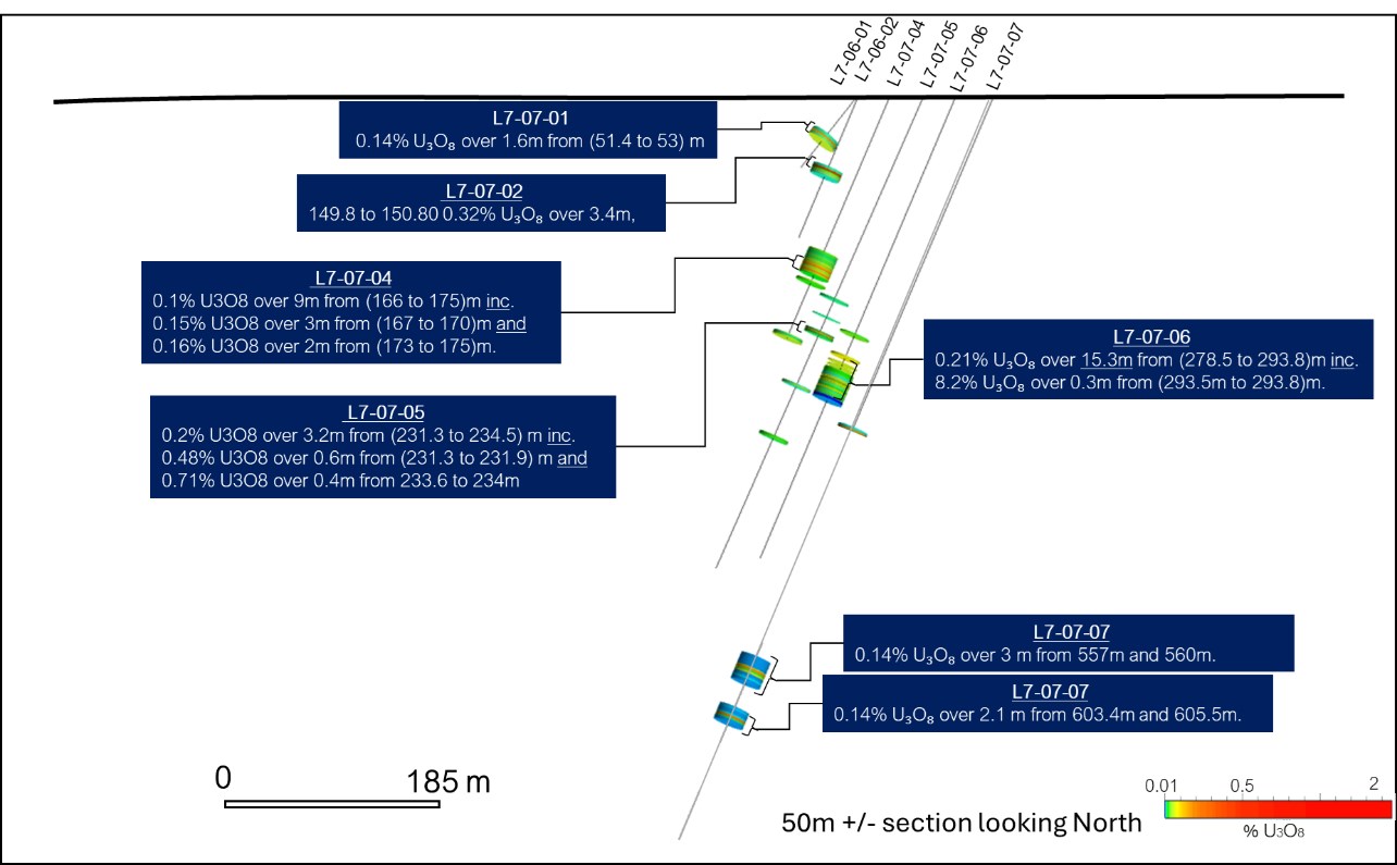 Historical drilling at Lucky 7 returned 17.3 m at 0.30% U3O8 in L7-07-08 and 10.0 m at 0.35% U3O8 in L7-07-10 (Figure 2), with mineralization traced to depths of more than 500 metres.