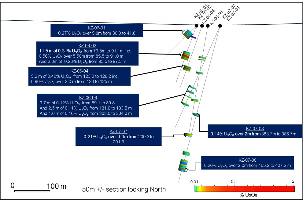 Figure 3: KZ Zone longitudinal section showing historical drill results from 2006 and 2007 by Pacific Ridge. Drilling intersected multiple zones of uranium mineralization over a broad vertical extent, including higher-grade intervals that highlight the scale and continuity of the system.