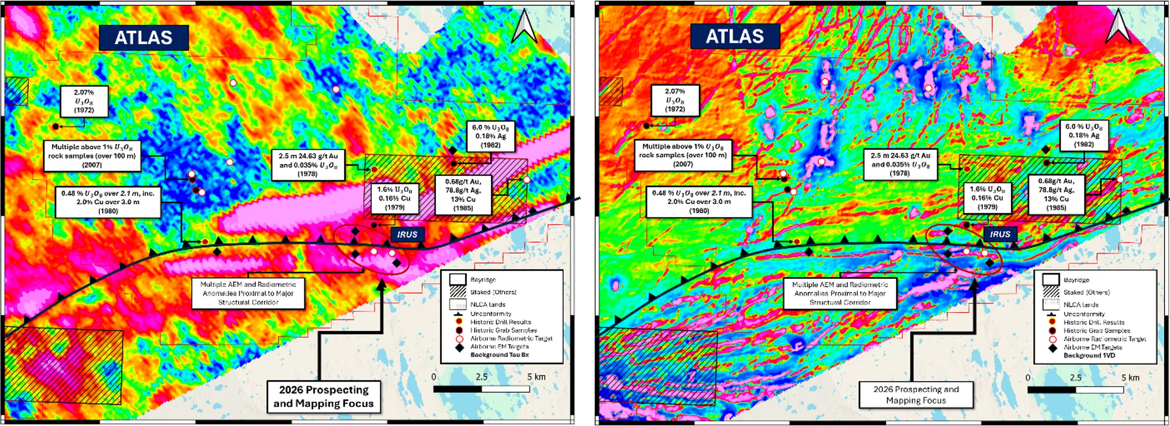 Within Atlas, Iris has been identified as a 2026 priority for mapping and prospecting at the junction of a conductive anomaly and the interpreted unconformity.