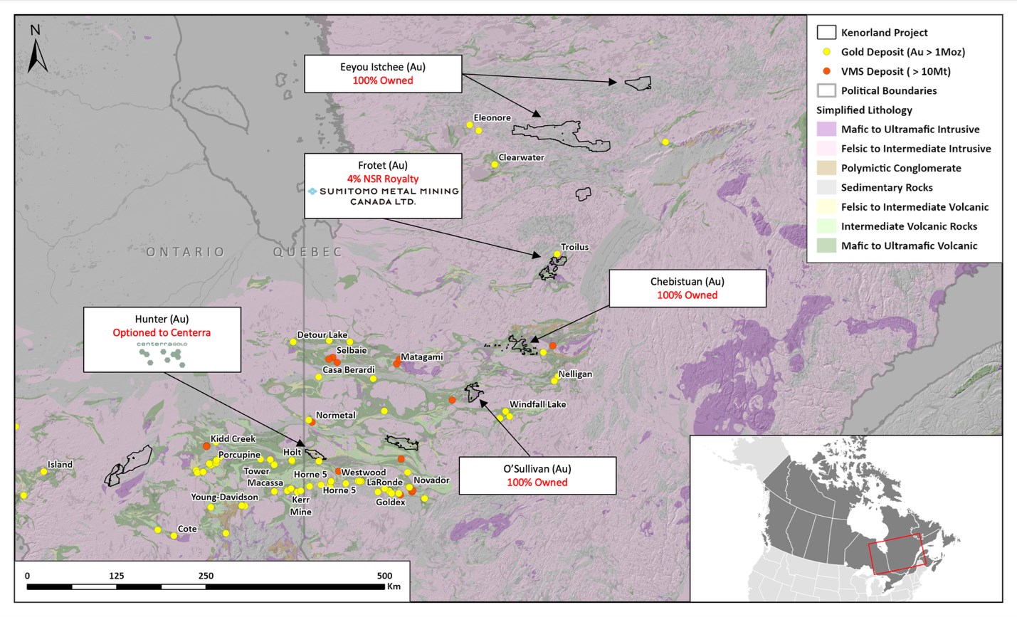 Kenorland Minerals Ltd. (TSXV: KLD) is a well-financed mineral exploration company focused on project generation and early-stage exploration in North America. Kenorland's exploration strategy is to advance greenfields projects through systematic, property-wide, phased exploration surveys financed primarily through exploration partnerships including option to joint venture agreements. Kenorland holds a 4% net smelter return royalty on the Frotet Project in Quebec, which is owned by Sumitomo Metal Mining Canada Ltd. The Frotet Project hosts the Regnault gold system, a greenfields discovery made by Kenorland and Sumitomo Metal Mining Canada Ltd. in 2020, which contains an Inferred Mineral Resource of 14.5 Mt at 5.47 g/t Au for 2.55 Moz of gold. Kenorland is based in Vancouver, British Columbia, Canada.