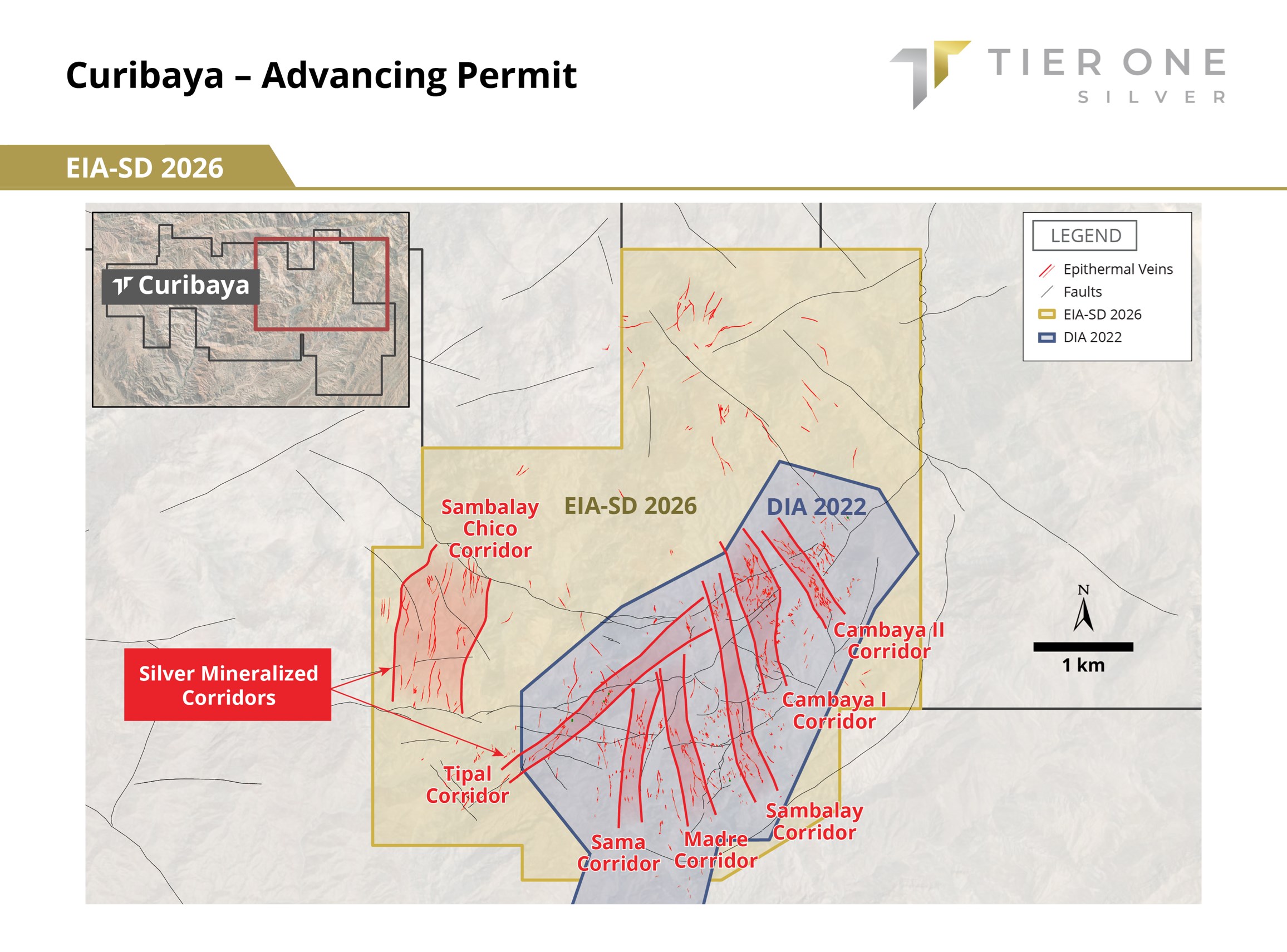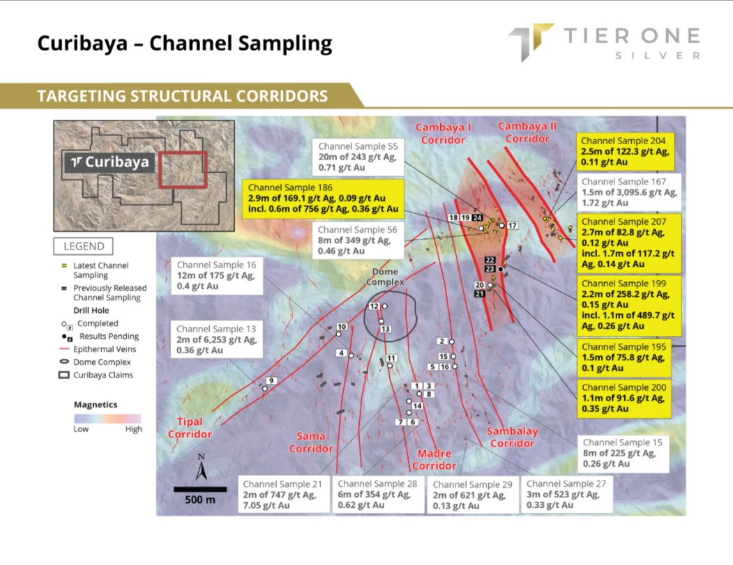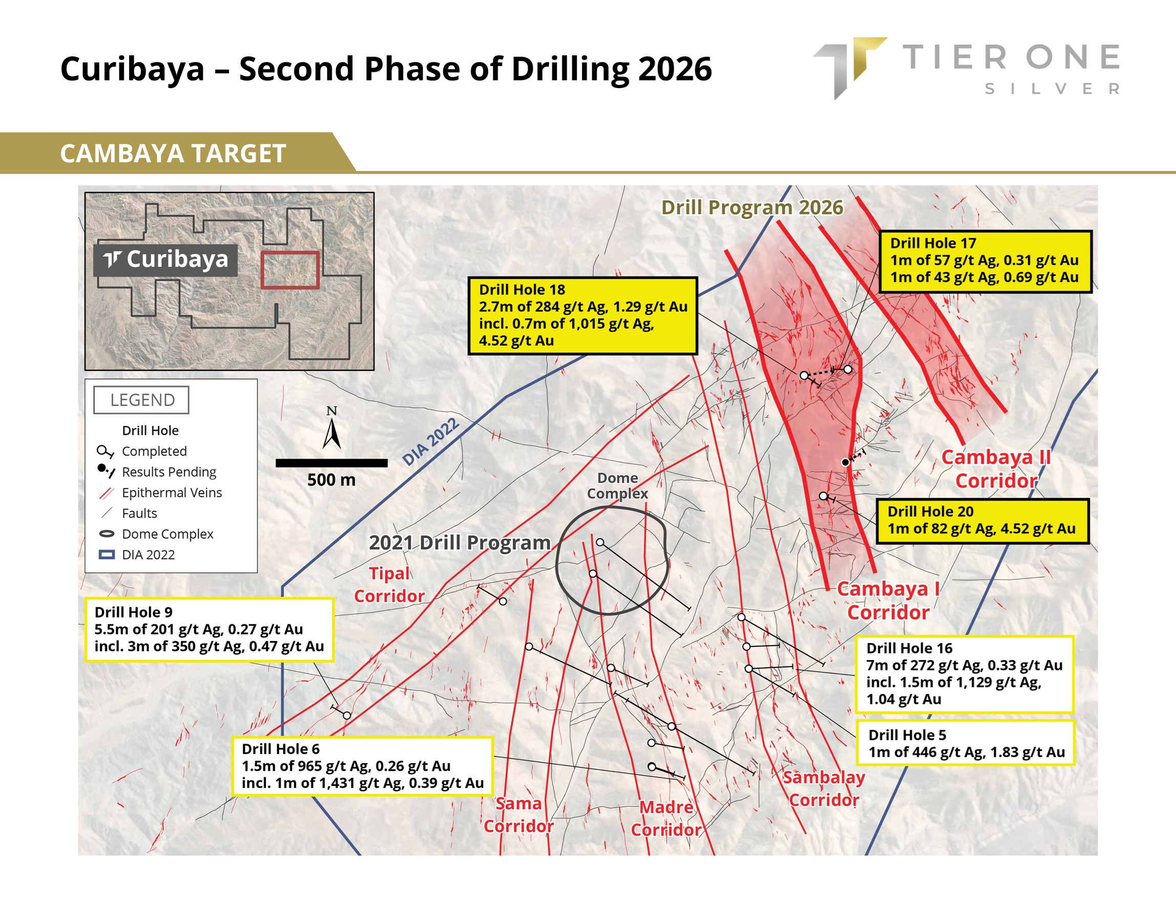 Peter Dembicki, CEO and President of Tier One, commented, "Phase 2 drilling at Curibaya continues to validate a large, consistent high-grade silver-gold epithermal system across the Cambaya I corridor demonstrating vertical continuity and strike extension. Early Phase 2 results strengthen our regional geological model and suggest meaningful expansion potential, with indications from Phase 1 drilling that a potential copper-type system could be present in deeper zones nearby. With additional assays pending, and plans to significantly increase drilling capacity, we are increasingly confident in defining an important precious-metals system and demonstrating Curibaya's upside."