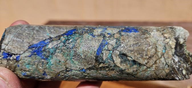 Core sample from DDH M-2 at the core interval of 284.45m showing fracture-controlled azurite (blue) and malachite (green) copper mineralization.