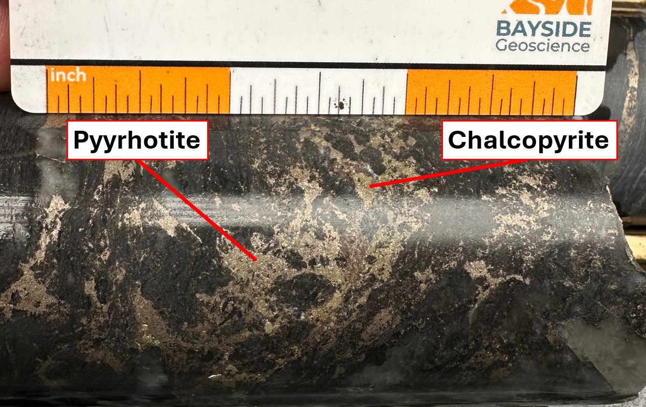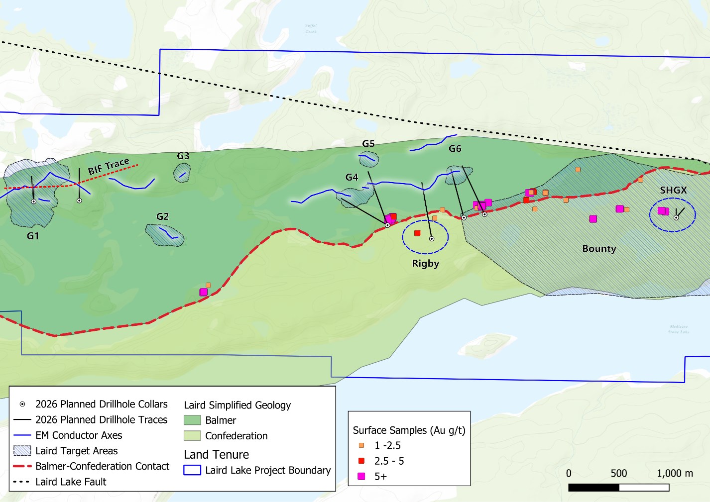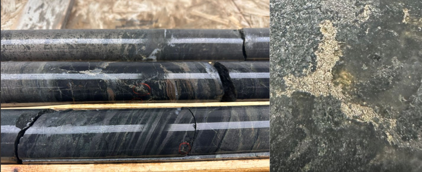 Core logging from the ongoing drill program has successfully identified a shallow, broad ~179 m wide (108-287 m; true width is unknown) package of variably mineralized BIF and mafic volcanic rocks within the Balmer Formation. Zones of increased pyrrhotite-pyrite-chalcopyrite mineralization are generally associated with higher degrees of silica-diopside-garnet-biotite alteration and intense folding. In the Red Lake camp, structurally complex, sulphide-replaced BIFs are historically known to be host rocks for high-grade gold deposits, such as the Fork deposit at West Red Lake Gold's Madsen mine, located ~10 km east of Laird Lake. At the Fork deposit, gold mineralization occurs in deformed quartz-sulphide veins and local replacement-style disseminations within strongly altered iron formation, mafic and ultramafic rocks, with accessory pyrrhotite, pyrite, and chalcopyrite in vein selvedges and alteration envelopes (NI 43-101 Technical Report and Prefeasibility Study for the Madsen Mine, Ontario, Canada, effective January 7, 2025). At Laird Lake, intersecting this sulfide mineralized BIF target exactly where historical SkyTEM magnetic and electromagnetic (EM) data predicted provides a strong validation of the Company's geological model. Core from the initial hole is currently being prepared for assaying.