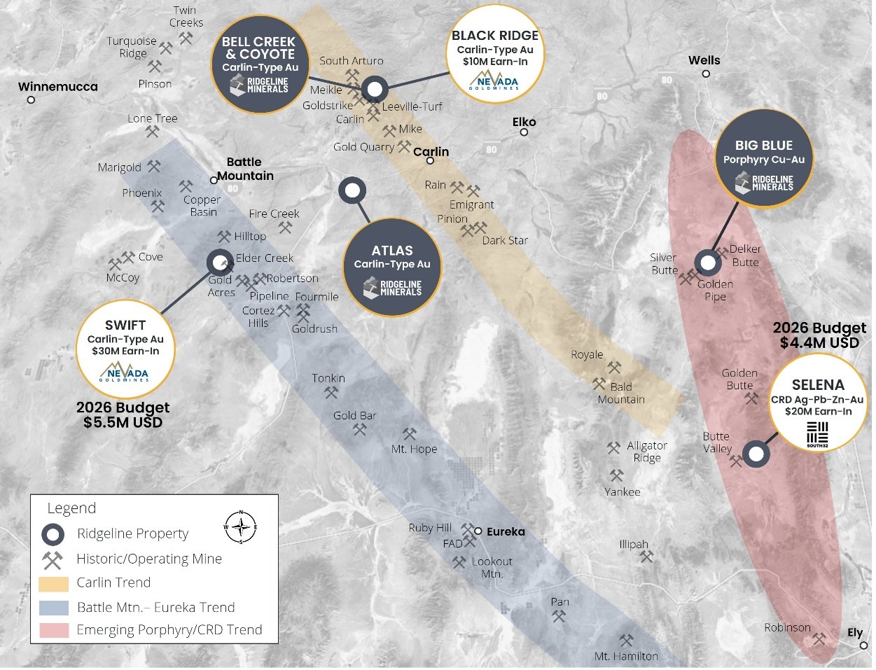 Chad Peters, Ridgeline's President, CEO & Director commented, "Selena and Swift continue to exhibit strong exploration potential with our partner-funded budgets continuing to increase year over year. 2026 represents our largest partner-funded exploration budget in Company history and provides our shareholders with exposure to gold, silver and base metal discoveries in mining friendly Nevada, while also reducing risk and minimizing shareholder dilution through our hybrid exploration model."
