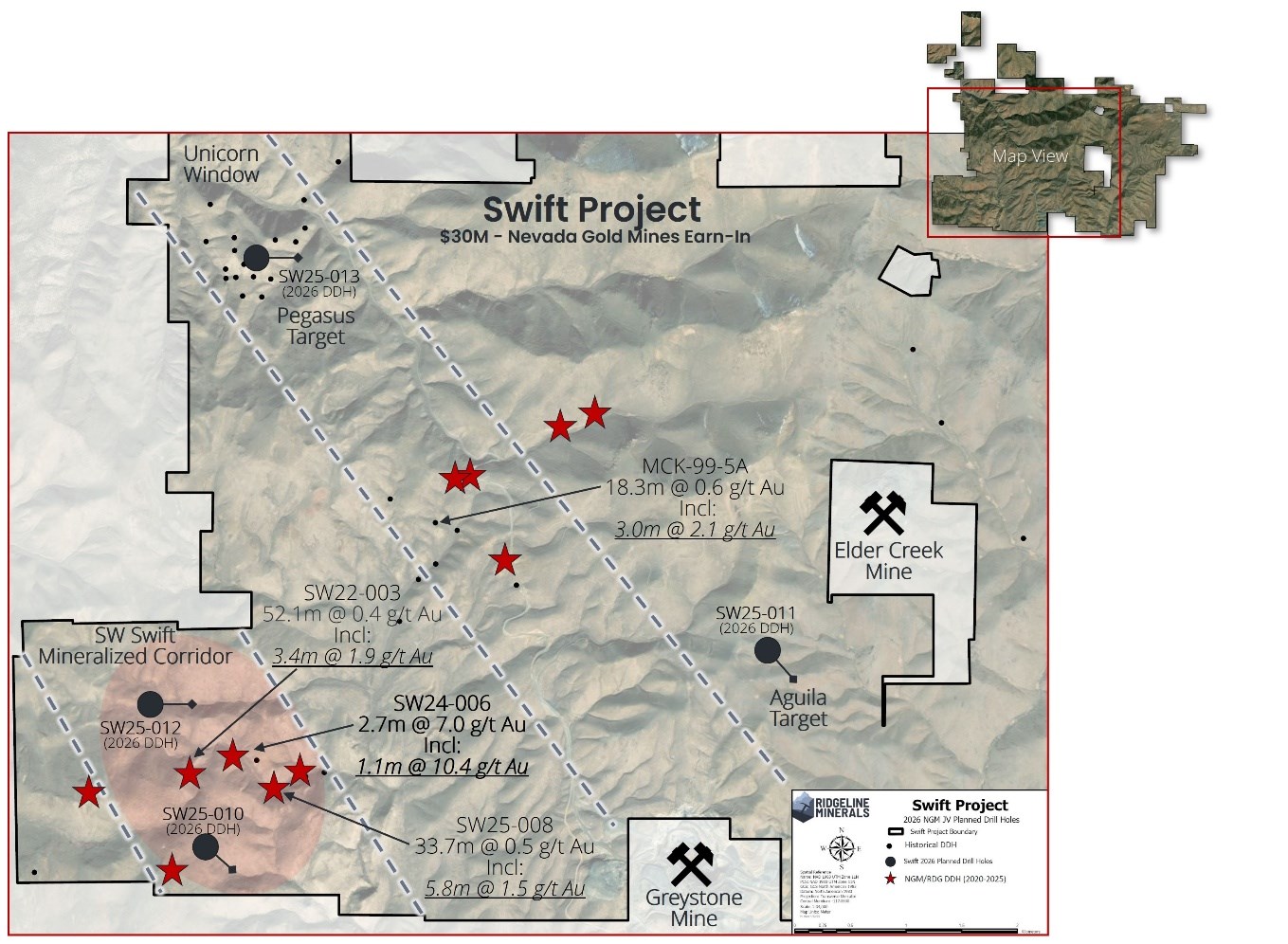 The Swift project is Carlin-Type gold exploration project being operated by Nevada Gold Mines ("NGM") under Phase I of an exploration earn-in agreement totaling up to US$20,000,000 in NGM expenditures over a 5-year period. NGM has approved a 2026 exploration budget of US$5,500,000 for a projected total of US$20,000,000 in qualifying expenditures, which will satisfy Phase I of the exploration earn-in agreement (for more details see September 22, 2024 press release HERE).