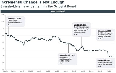 | Urges Sylogist Shareholders to Replace Entrenched, Underperforming Directors that Have Presided Over Severe Capital Erosion at April 7 Special Meeting of Shareholders Highlights Track Record of Inadequate and Reactive Changes by a Board that Cannot be Trusted to Select New CEO or Lead a Turnaround Calls on Sylogist Board to Implement Meaningful Change to Avoid a Costly and Distracting Proxy Fight BRIDGETOWN, Barbados, Feb. 19, 2026 /CNW/ -- OneMove Capital Ltd. ("OneMove"), an approximately 9.22% shareholder of Sylogist Ltd. (TSX: SYZ) ("Sylogist" or the "Company"), today reiterated the urgent need for change on the Sylogist Board to address years of severe value destruction resulting from what it believes are structural governance failures and responded to misleading statements about OneMove by the Company. In OneMove's view, Sylogist's pattern of incremental, reactive change to the Board and management team has failed to address the deeper governance issues that have contributed to years of sustained underperformance. OneMove is pleased that shareholders will have the opportunity on April 7 to elect a board they can trust to identify and recruit a world-class Chief Executive Officer to replace Interim CEO Craig O'Neill and lead a long-overdue turnaround at the Company. Shareholders Deserve More Than Cosmetic Change OneMove is fully aligned with the 35% of shareholders who support Sylogist's opposition to the requisition for a Special Meeting. It would have strongly preferred to not need to requisition a meeting, and has provided the Board numerous opportunities to implement meaningful change for the benefit of all shareholders. However, the Board has outright rejected any realistic path to a settlement. After five months of engagement and a formal requisition of a special meeting, the Board waited until the end of last week to even contemplate meeting OneMove's highly-qualified nominees – and has still not met with any of them. A Board that is serious about fixing Sylogist's deep-rooted problems would be urgently evaluating all credible options and candidates, not slow-walking discussions to protect its own seats. OneMove remains open to constructive engagement with Sylogist and urges the Board to come to the table to reach a reasonable settlement that avoids a costly and distracting proxy fight. OneMove has been clear that any resolution must include Barry Foster stepping down as a director as a necessary step toward restoring credibility and allowing the Company to move forward. Shareholders Deserve Directors Who are Aligned with Their Interests OneMove agrees that no single shareholder should exert control over Sylogist. However, it is difficult to reconcile that principle with the fact that PenderFund's nominee, Errol Olsen, who is directly affiliated with PenderFund through Pender Software Holdings, now serves as Chair of the Board. The stock has declined by approximately 48% since Mr. Olsen joined the Board in 2023. In OneMove's view, restoring confidence requires a Board led by independent directors with appropriate checks and balances, not one where Board leadership is distorted by nominee agreements amid prolonged underperformance. OneMove is confused by the Board's allegations of value destruction. OneMove's only other public shareholder engagement was its recent and successful intervention at Dye & Durham after Engine Capital - which PenderFund supported - allowed performance to deteriorate. OneMove intervened quickly and worked constructively with other shareholders to help stabilize the Company, and transformation initiatives are now underway. At Sylogist, shareholders are in year three of PenderFund's so-called "transformation," yet the Company's profitability and share price trajectory continue to worsen. Shareholders have Lost Faith in the Sylogist Board Shareholders have reacted consistently and decisively to incremental changes by the Company over the past year, which has been clearly reflected in Sylogist's share price. Beginning with Kim Farrell's appointment in February, 2025, Sylogist's stock has fallen dramatically following announcements regarding Company governance, signaling that shareholders have lost faith in the Board's ability to manage a turnaround. In the continued absence of genuine receptivity by the Board to implement the change needed at Sylogist, OneMove looks forward to shareholders having the opportunity to elect its four highly-qualified nominees at the special meeting of shareholders to be held on April 7, and to providing additional detail about its focused plan to create shareholder value in the coming weeks. About OneMove Capital Ltd. OneMove Capital Ltd. is a private investment firm focused on unlocking value in technology-enabled businesses through disciplined governance, strategic oversight, and long-term shareholder alignment. Information in Support of Public Broadcast Exemption under Canadian Law The information contained in this press release does not and is not meant to constitute a solicitation of a proxy within the meaning of applicable corporate and securities laws. Shareholders of the Company are not being asked at this time to execute a proxy in favour of OneMove's director nominees or in respect of any other matter to be acted upon at the Special Meeting. In connection with the Special Meeting, OneMove intends to file a dissident information circular in due course in compliance with applicable corporate and securities laws. Notwithstanding the foregoing, OneMove has voluntarily provided in, or incorporated by reference into, this press release the disclosure required under section 9.2(4) of NI 51-102 – Continuous Disclosure Obligations ("NI 51-102") and has filed a document (the "Document") containing disclosure prescribed by applicable corporate law and disclosure required under section 9.2(6) of NI 51-102 in respect of OneMove's director nominees, in accordance with corporate and securities laws applicable to public broad